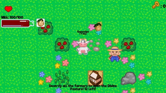 Farmageddon: A Cattle Royale is a series of cow puns masquerading as a new kind of roguelite. Try to claim the divine pasture while picking up items along the way to improve your build! But be careful: every player's run is recorded, and you'll be playing against the ghosts of every run attempted in the same day, including your own!