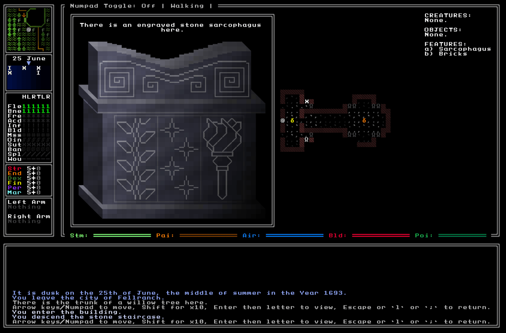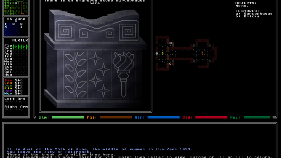 Ultima Ratio Regum ("the last argument of kings") is a game which aims to integrate thematic content on historiography, philosophical idealism and the rise of modernist grand narratives, with the deep, complex and challenging gameplay one expects from a "classic" roguelike (and, of course, an ANSI display and permadeath). Set approximately around the Scientific Revolution, the player is tasked with discovering a conspiracy via identifying procedurally-generated clues hidden throughout the world's cultures, religions and societies; the game features extensive procedural generation of everything from tombs and religious altars to (in the future) paintings and sculptures, any or all of which may contain the clues required in a given playthrough.