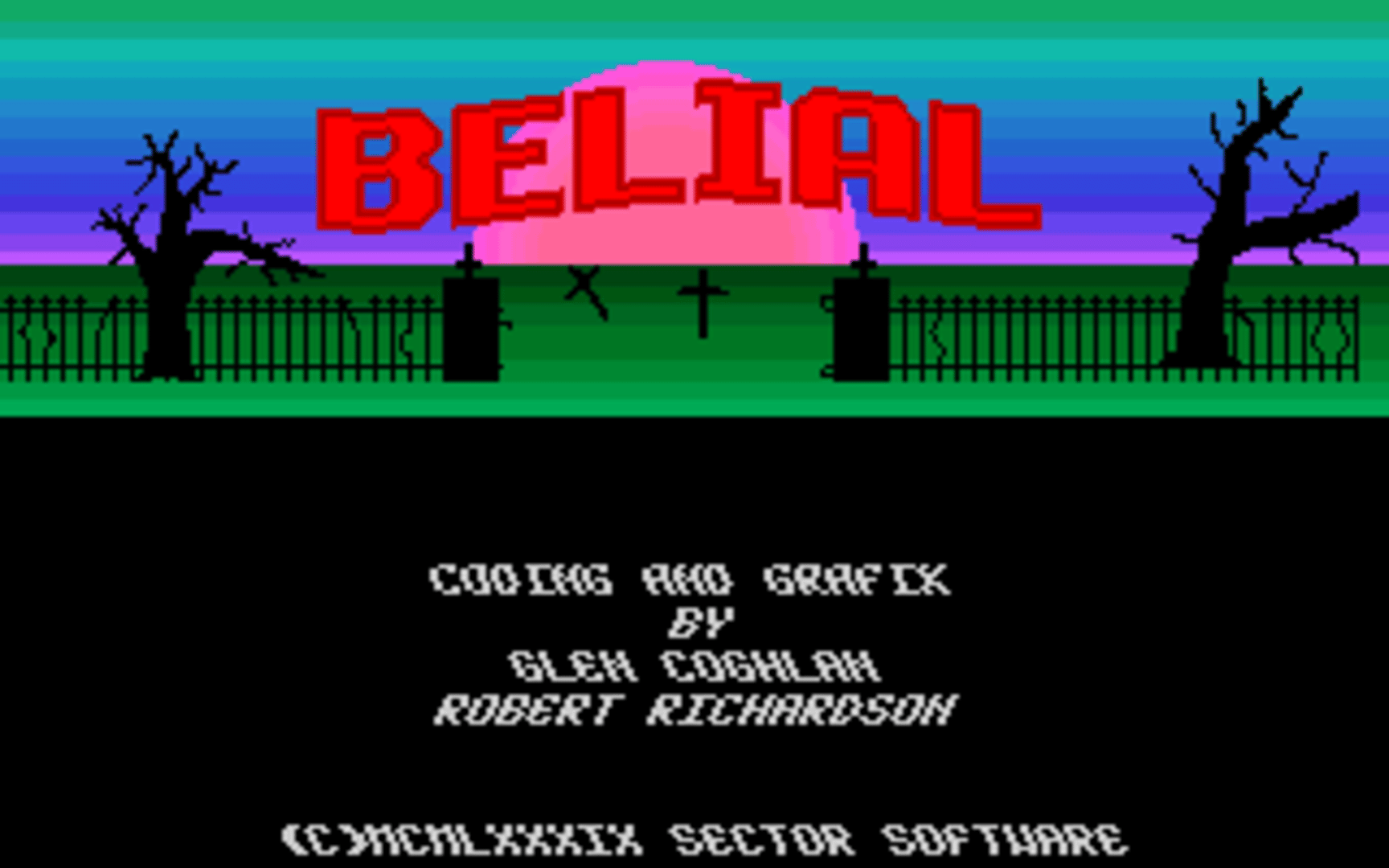 Belial is 2D side-scrolling platform game, clone of Ghosts 'N Goblins, without story in-game. The player controls a bearded man, who can shoot small bullets. He goes into the right side of the screen, shoots various enemies (like zombies, bouncing Jack-o'-lanterns, jumping one-eyed monsters, plants etc.), and jumps over obstacles and holes. The game hasn't restarted points - when players lost life, he returns to starting point on each level.