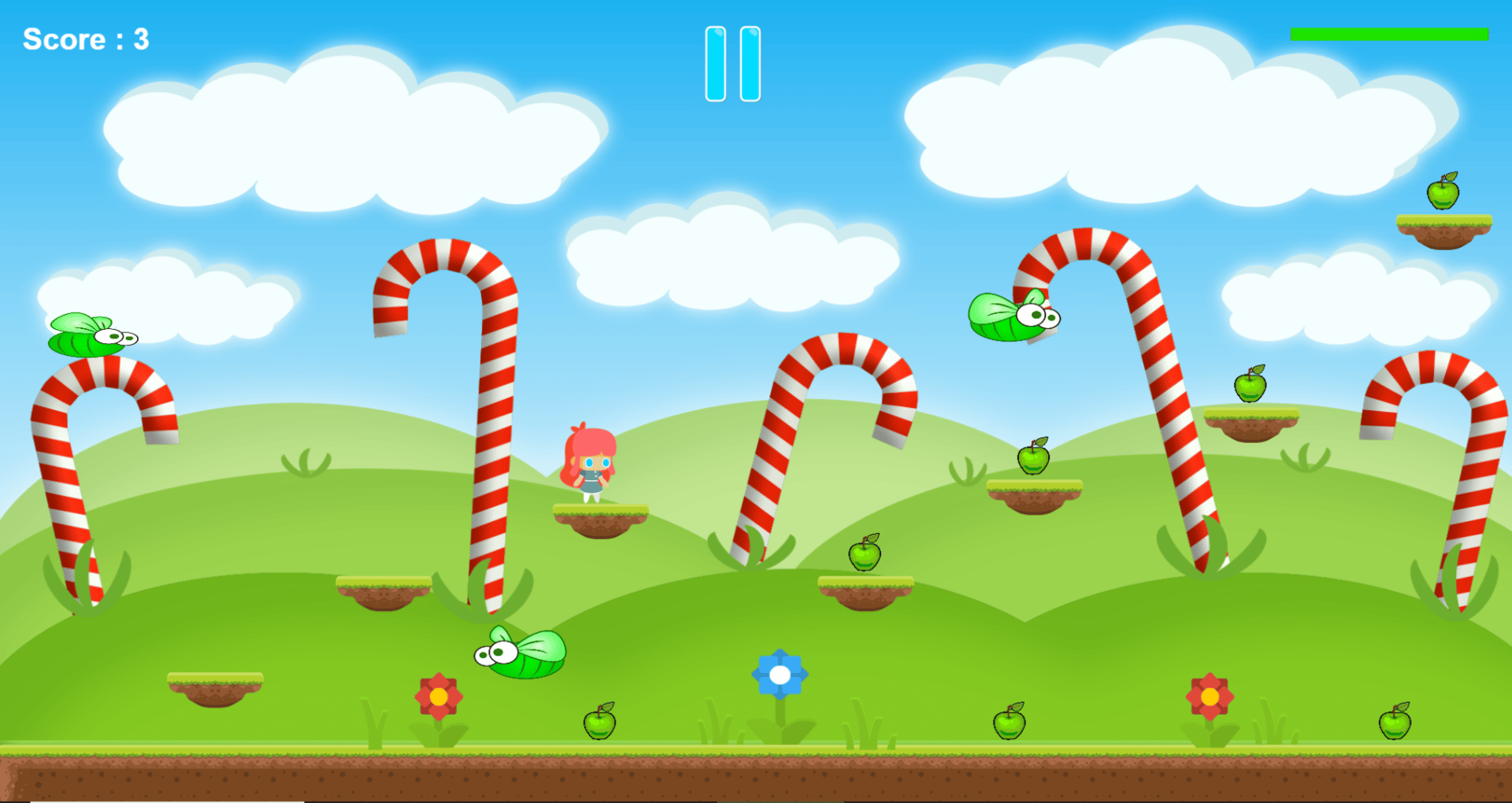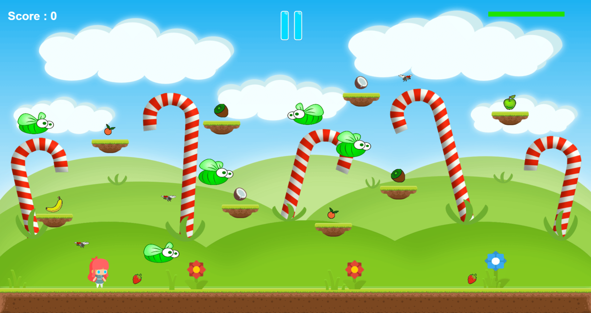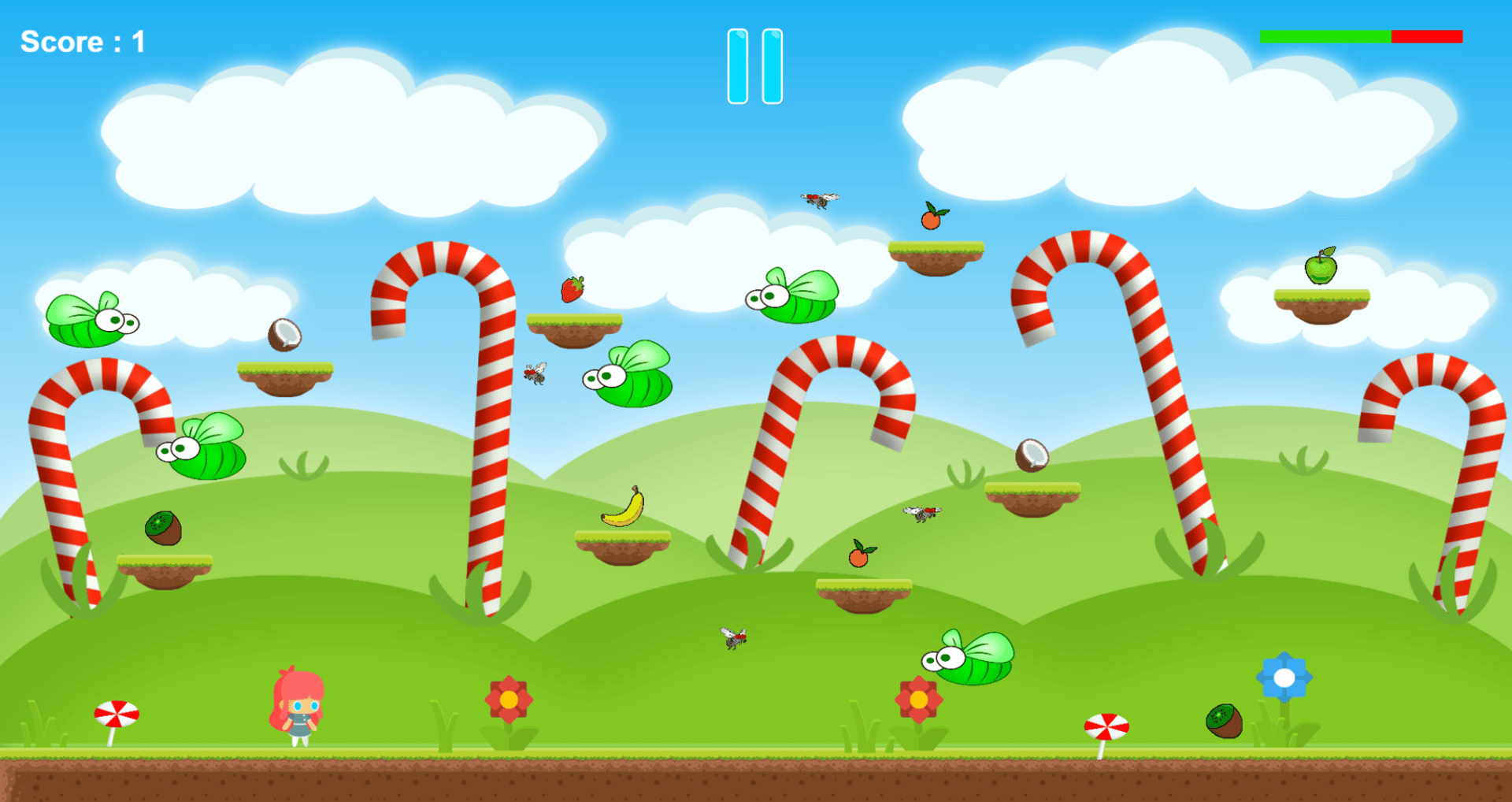 Little girl jumping and running through candy fields, picking what's good for her health, while at the same time staying away from dangers. Help her plan a healthy route avoiding obstacles on the way.