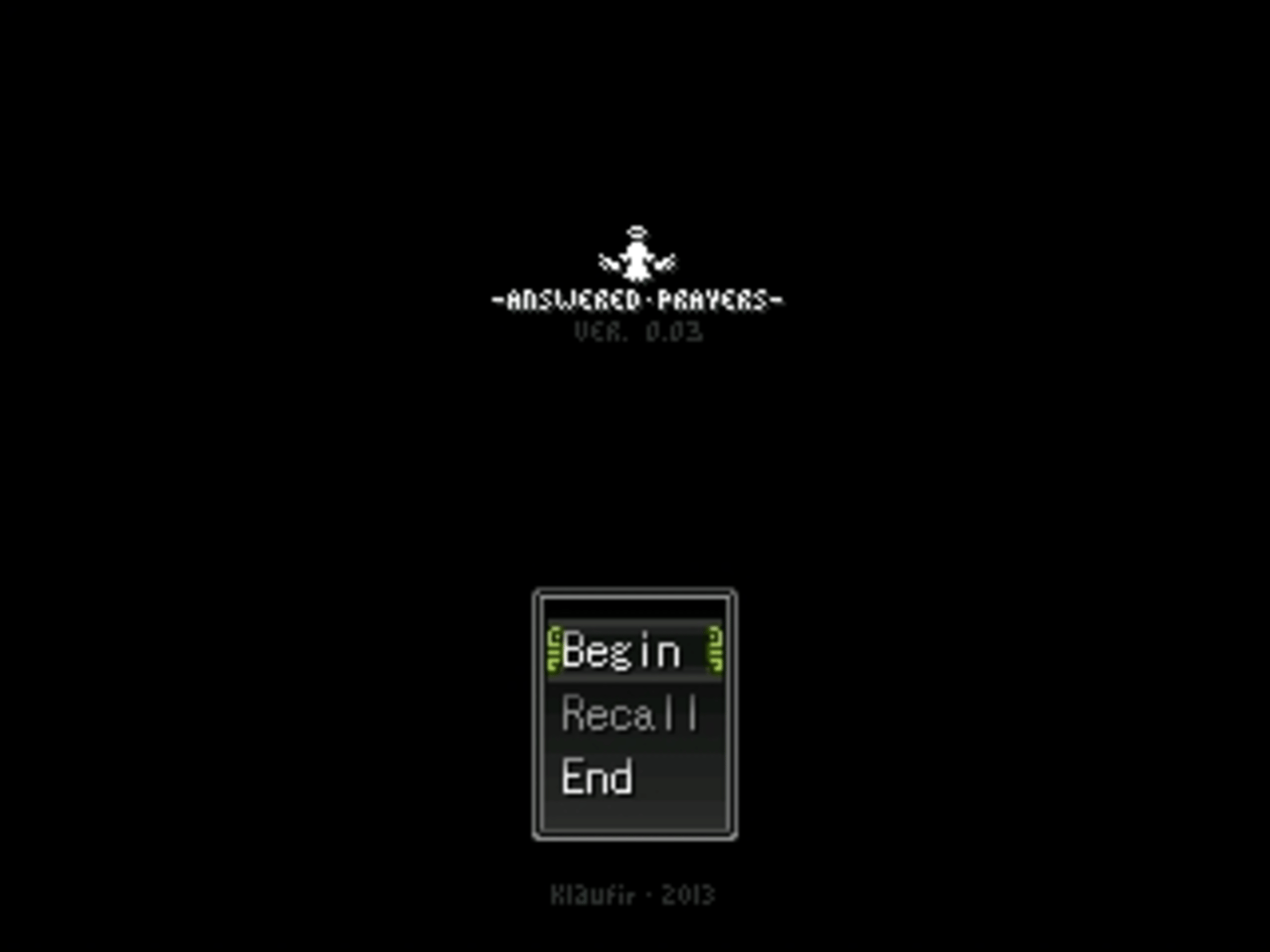 Answered Prayers is a Yume Nikki fangame made by Klaufir in RPG Maker 2003. One of the more well-known English fangames, Answered Prayers is also one of the 'lighter' Yume Nikki fangames. This game has plenty of areas to explore, with little gore/blood compared to many other Yume Nikki derivatives. The game was on hiatus between 2013 and 2022 to version 0.03 according to the official website, but the site was updated the 5th of July 2022, with new screenshots showing the future version 0.04 and is now noted as a version in development.