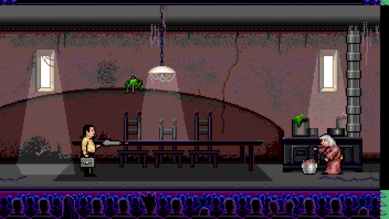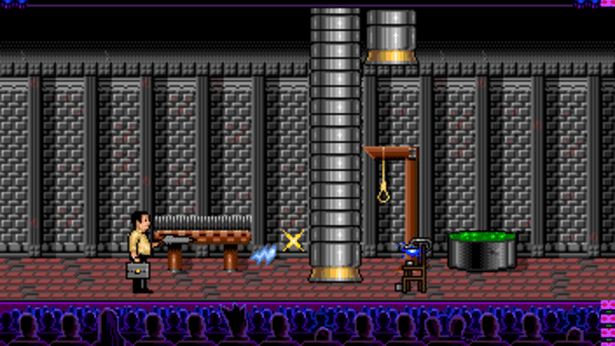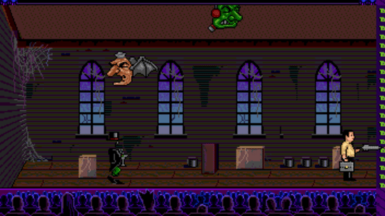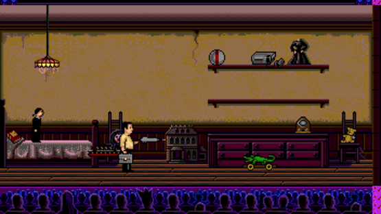 Based on the Addams Family movie, the TurboGrafx-16 CD version is quite different from the other Addams Family variants. The player is cast in the role of Tully Alford, the crooked lawyer of the Addams family. He finds out that somewhere in the family mansion, a great treasure is stored in a vault. He decides to venture into the mansion and retrieve the treasure. Naturally, this is going to be anything but easy, as the insane Addams family members and a legion of ghosts and monsters are there to make sure the lawyer fails... Like most other Addams Family incarnations, this is a side-scrolling action game. Tully Alford's only weapon is an umbrella that fires energy shots at enemies. Tully can also jump and duck to avoid enemy blows. The game world consists of a "hub" area, the hall of Addams Family mansion, and many rooms, most of which are locked in the beginning of the game. The gameplay consists mainly of exploring the accessible rooms and collecting keys that are needed to open other doors in the process. Some of the rooms contain treasure and power-ups, while others are infested by monsters or require the player to defeat a boss enemy in order to advance.