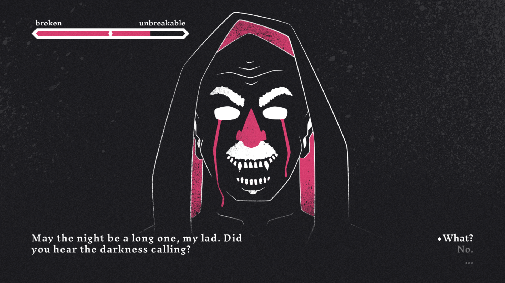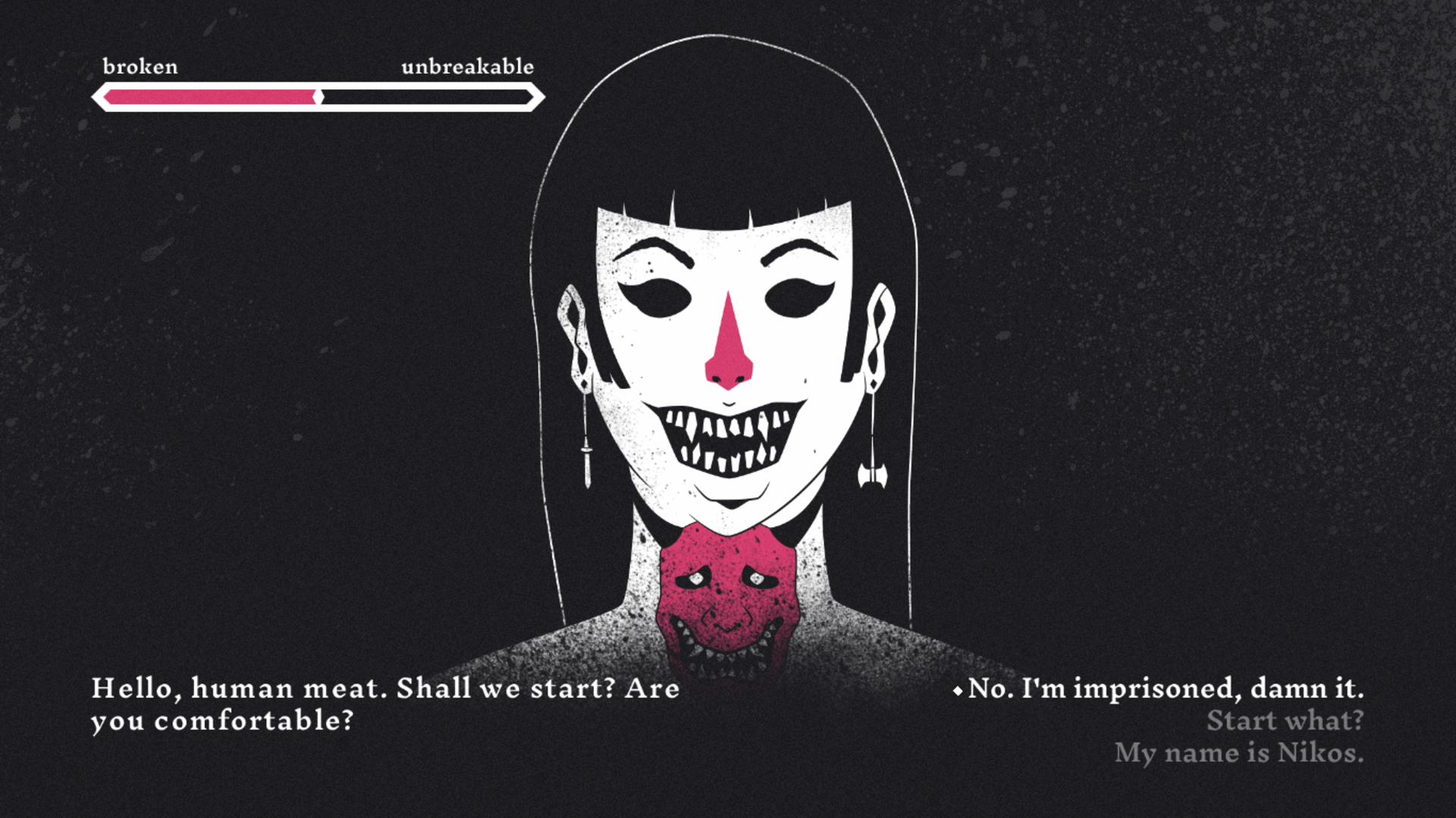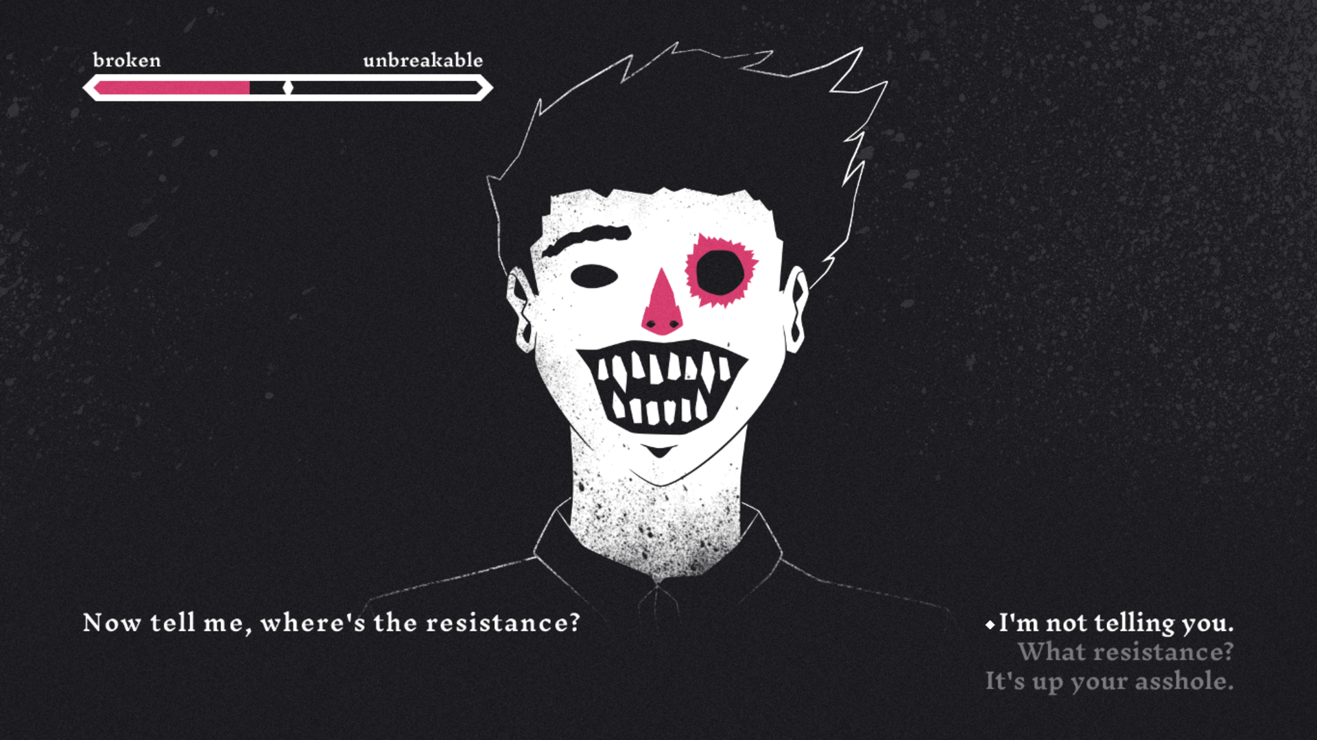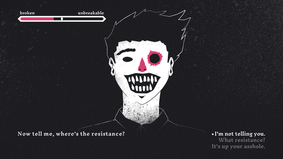 You are in a dark room. The vampire in front of you wants to know where is the human resistance hideout. You must resist. Be unbreakable or be broken.