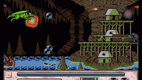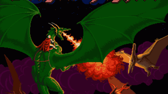 The player takes control of a magical human fighter who has the ability to transform himself into a flying dragon. As the fighter, the player can run, crouch, jump, and attack with his sword as he would in most side-scrolling action games. Underneath his life gauge is a "metamorphosis gauge" that will gradually be filled as the player destroys his enemies. When the metamorphosis gauge begins to flash, the player can transform into the dragon by pressing up and A button after jumping. As a dragon, the player will hover in the air while the screen scrolls automatically to the right, similarly to a side-scrolling shoot-'em-up game. The dragon's main attack is his fire breath. While the player can fly in any of the eight directions, they cannot turn around and the dragon will only face and attack to the right. While in dragon, the player's metamorphosis gauge will gradually be drained out. The player will transform back to a fighter if the metamorphosis gauge empties out completely or when the player rapidly taps the A button again. As the fighter, the player can also shoot a projectile attack by holding the B button until the character begins to flash. The types of projectile fired by the player depends on the color of the player's outfit, which can be changed by picking up certain power-up items labeled with the letters G (green, the player's default color), B (blue), and R (red). Changing the color of the player's outfit will also change the pattern of the dragon's fire breath attack. Other power-ups includes energy restoring potions, a flower that helps fill the metamorphosis gauge faster, and a ring that destroys all on-screen enemies. At the end of each stage, the player will receive a staff that will increase their maximum health. There are six stages in all, each with their own guardian awaiting to challenge the warrior at the end. The game will end if the player loses all of their life power and only three chances are provided to continue at the stage where they died before the player is forced to start all over.
