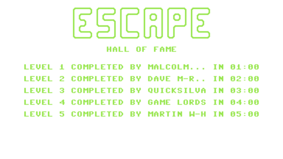 Inside a distant valley was a maze cut off from civilisation where many explorer as entered but never returned to say what was inside or on the other side. You are an explorer and have decided to navigate the maze and find the answers on the other side. Escape is a single screen top view maze game where the screen has many paths to walk along as you try to find an axe that is hidden to break a blue door at the other side. As you explore the maze you are being chased by a dinosaur and if he catches you then it is game over. When you walk over the axe then the border turns black and you pick it up but this slows you down and if a dinosaur is close then you can drop it to speed up. Once you manage to break the door then you are given a time and you can select another skill level (1-5) with more dinosaurs the higher the level.