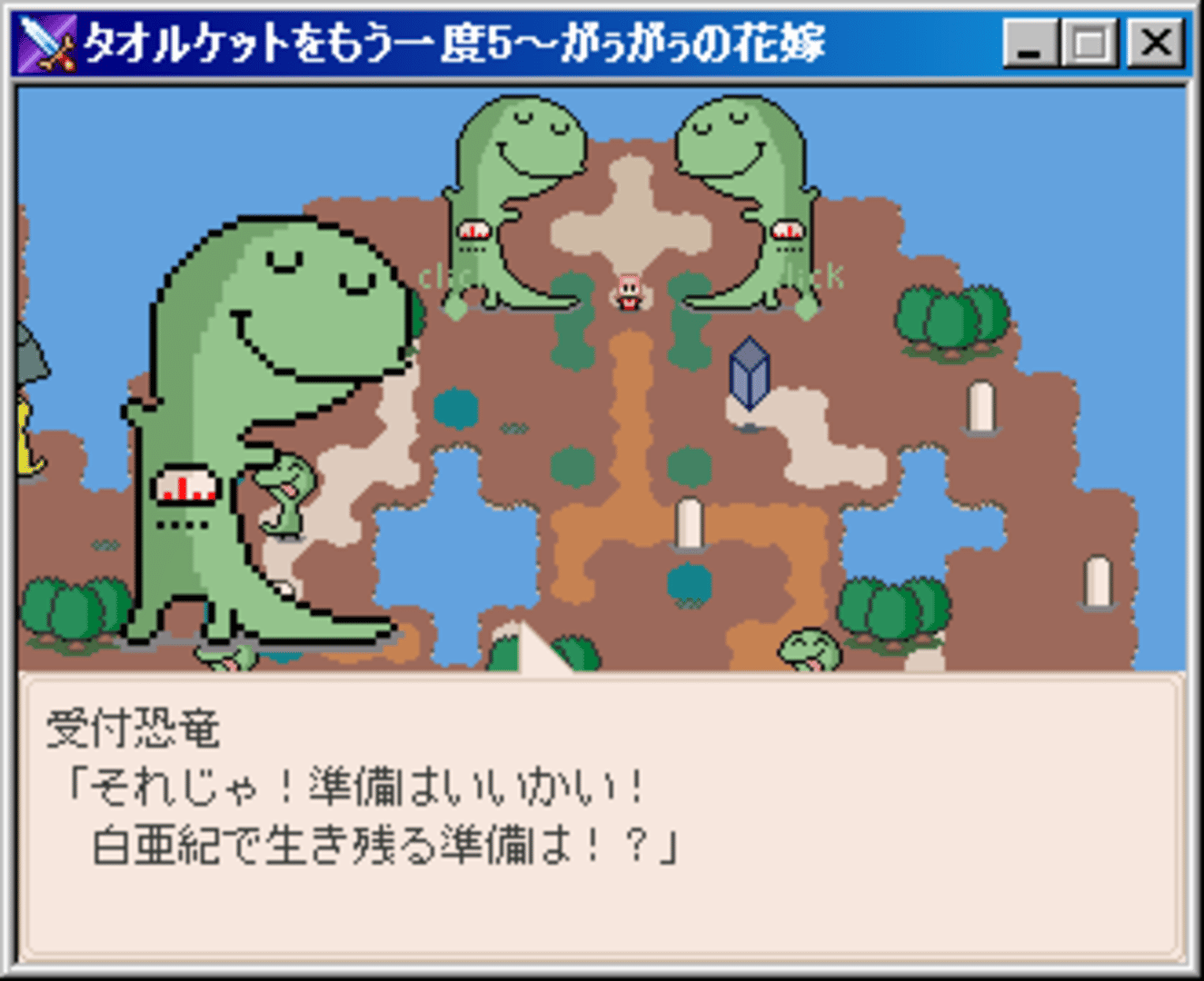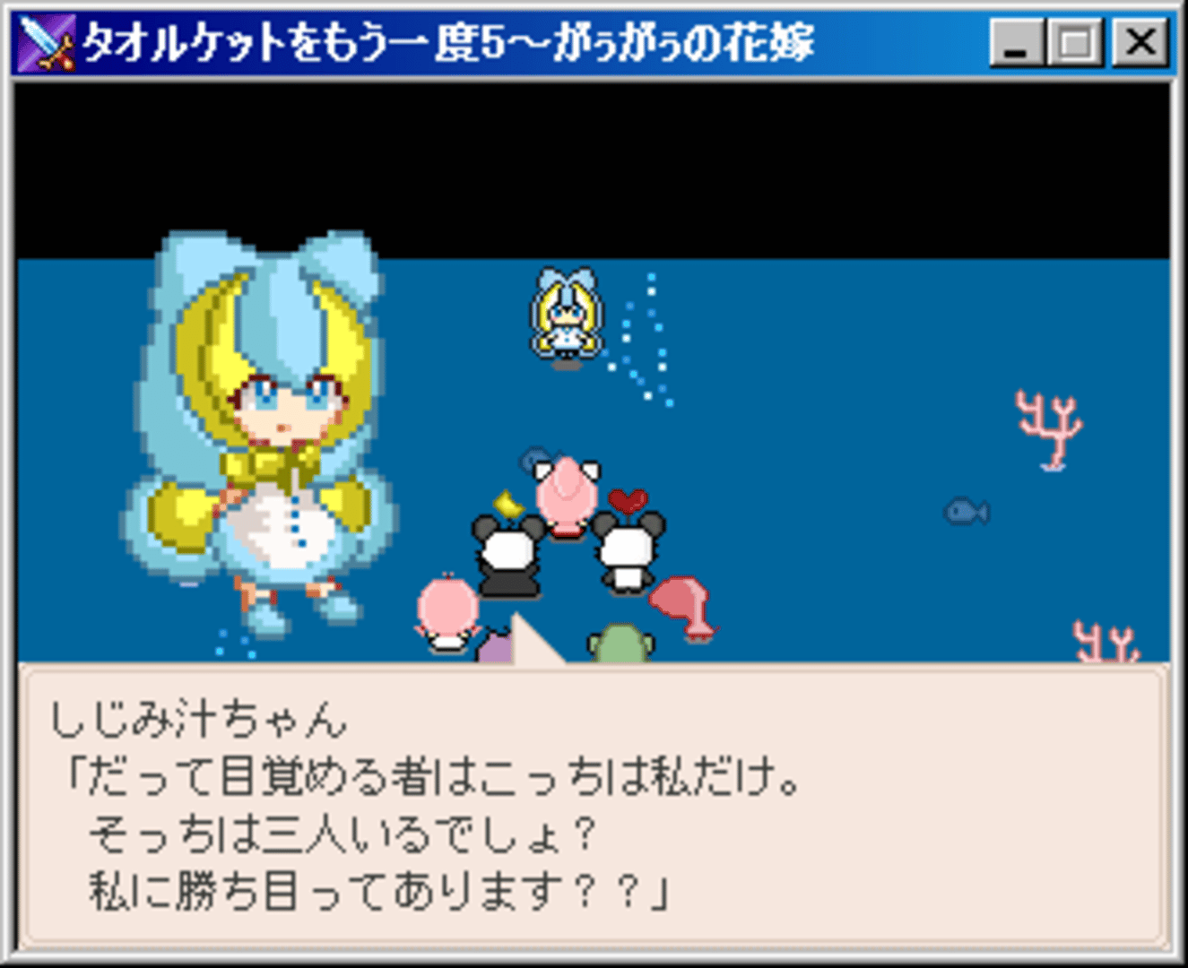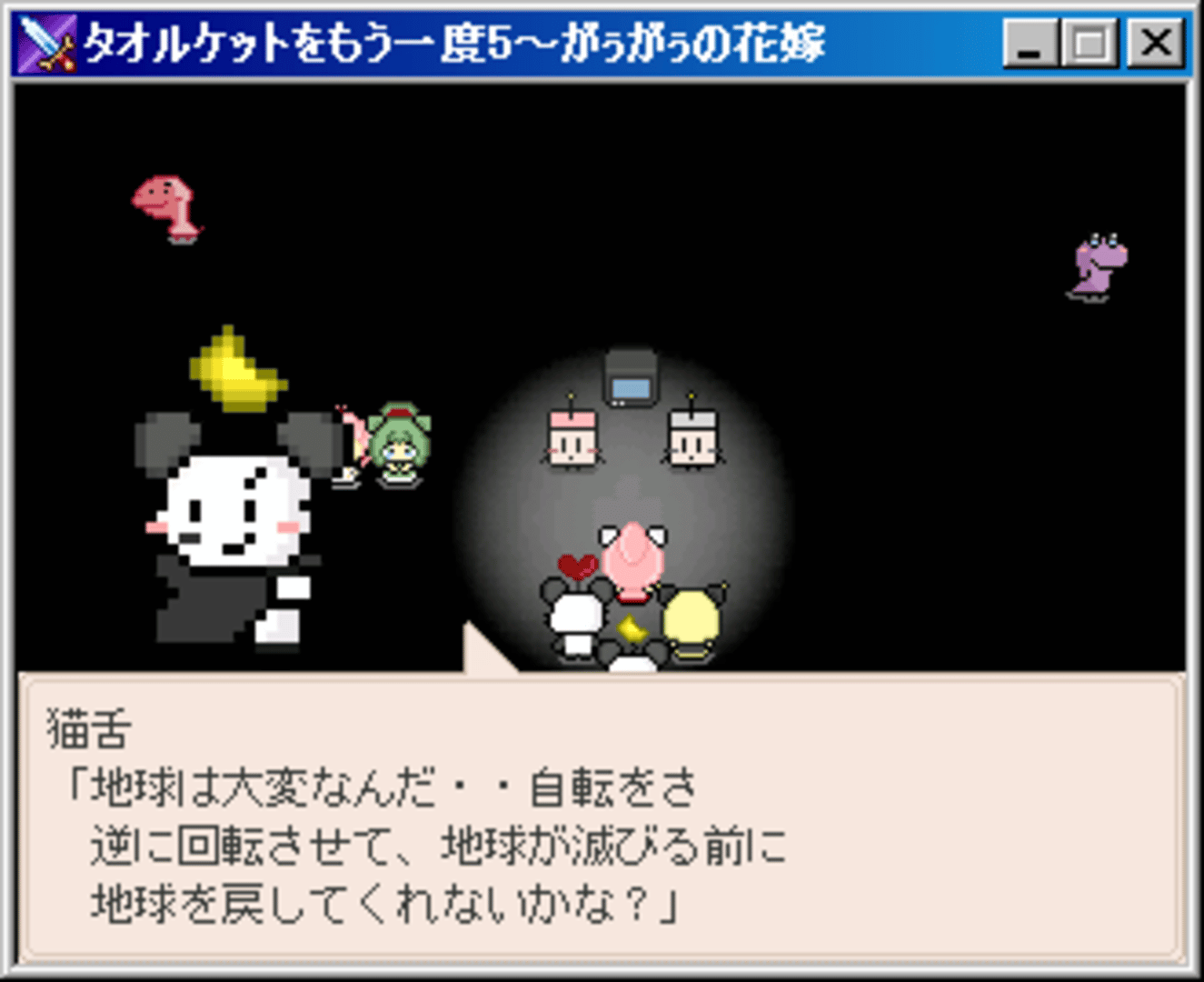 TK5 is much sillier than the past few games, and a lighthearted "back to the roots" of the series of sorts. Towelket ~Fury~ was meant to become TK5, but was cancelled and now Gaugau's Bride has its spot. There was also another prototype game called "Towelket Classic" or "Towelket Omote" which is only about an hour long.