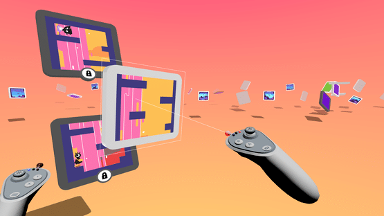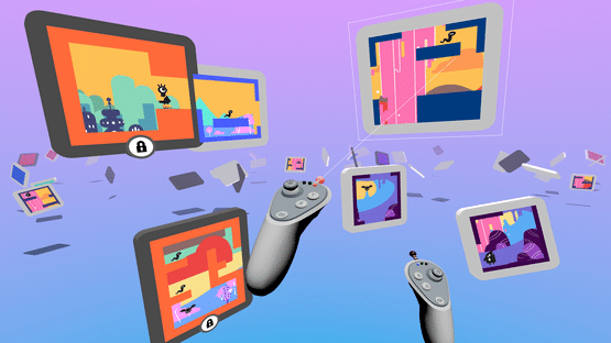A game played on TV screens floating in a surreal 3D VR space. On the screens the player controls Skategirl, who just destroyed the universe. The player in VR must grab, move and fit together the TV screens like jigsaw pieces to create a path Skategirl can move through to escape the horrible, horrible consequences of her own actions. But like, in a fun way.