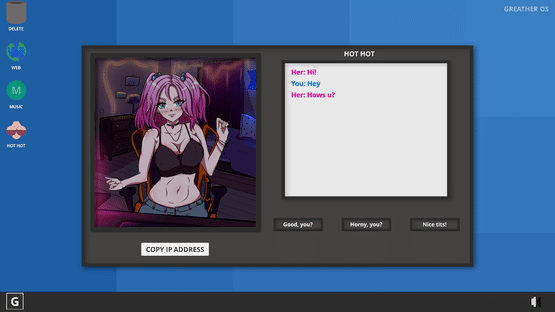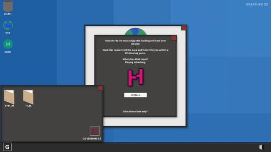 Explore your new desktop, choose your wallpaper, listen to music, check out the web and even install applications. When you're ready, install Hack-Her and jump into the 2D shooter hacking software, destroy enemies to retrieve data, while secretly watching and listening to your target via her webcam.