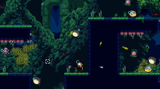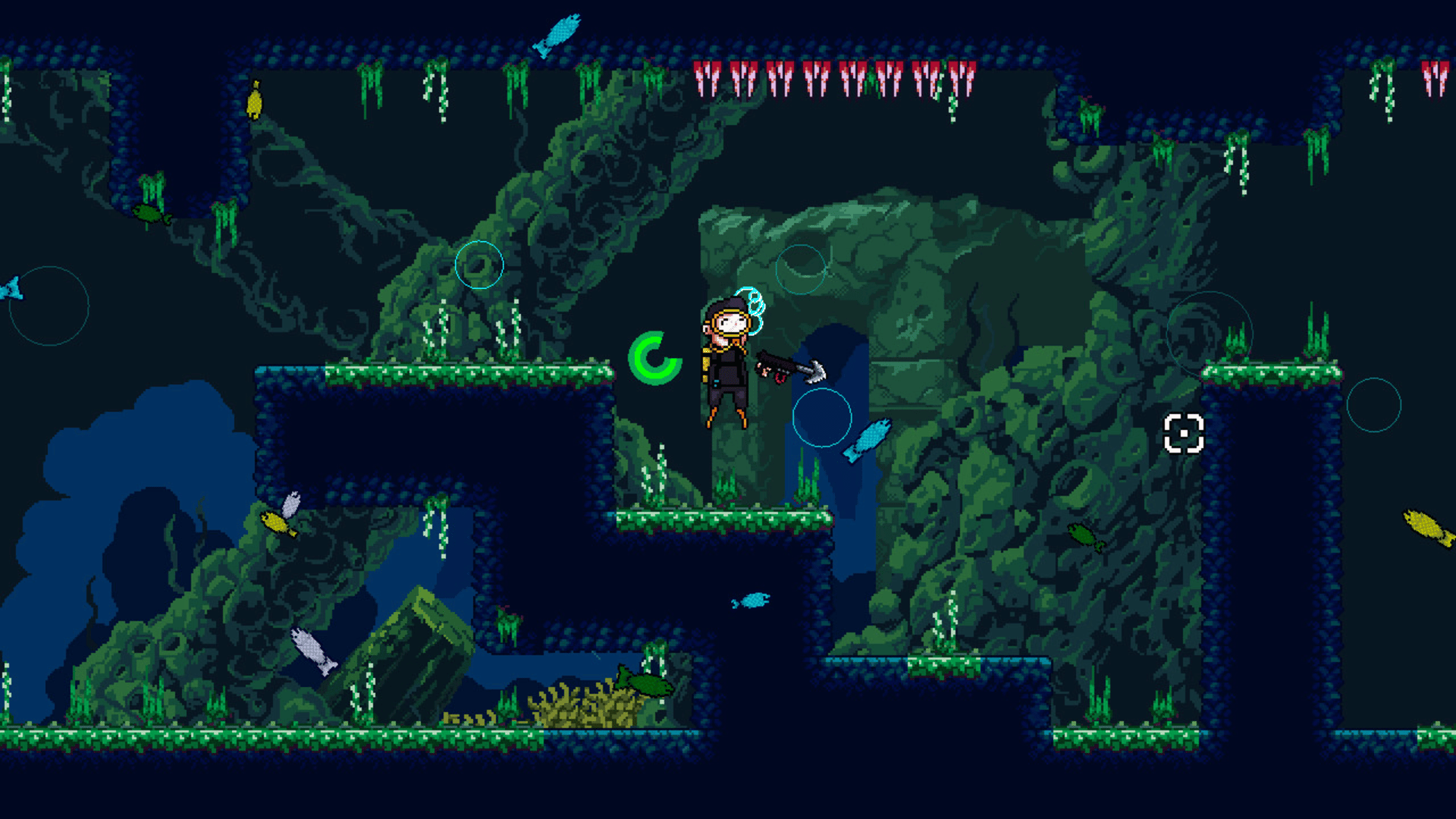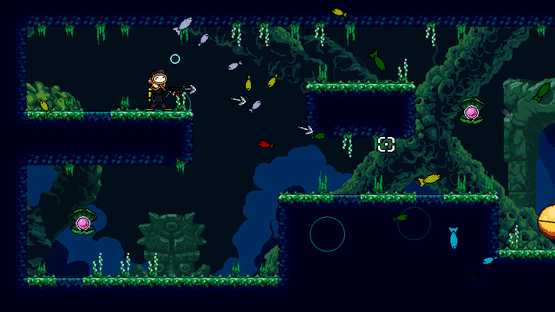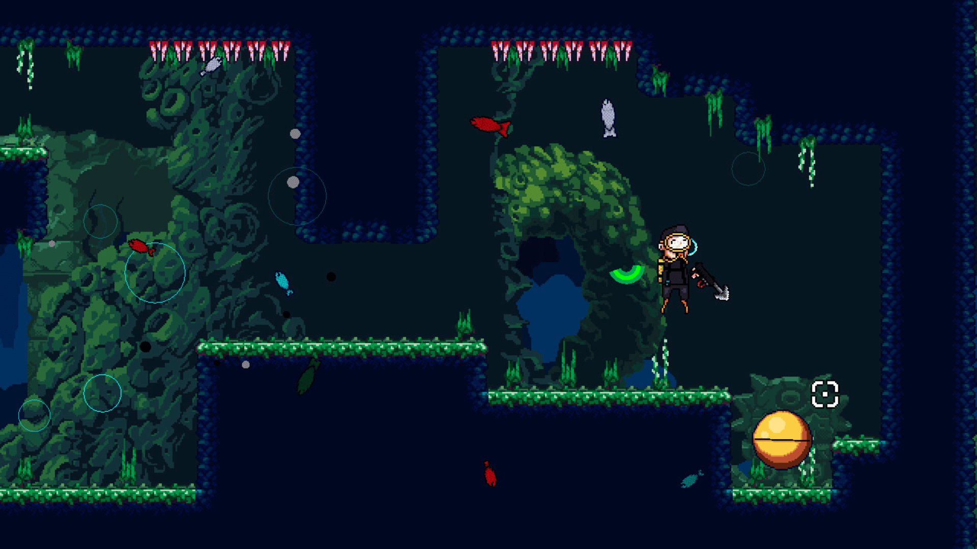 Drowned Gems is a 2d platformer game where the player in the underwater world shoots off fish scurrying in different directions and collects pearls that are scattered across the water levels.