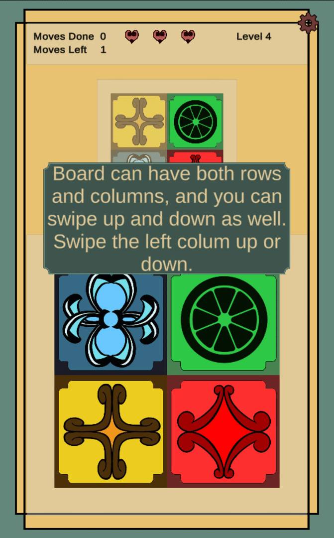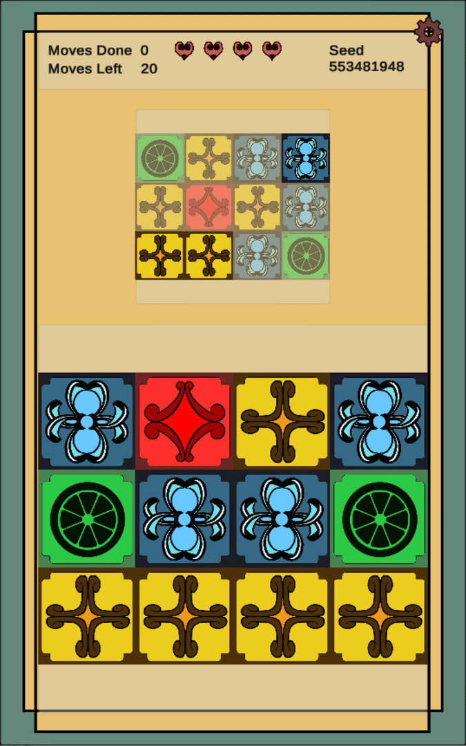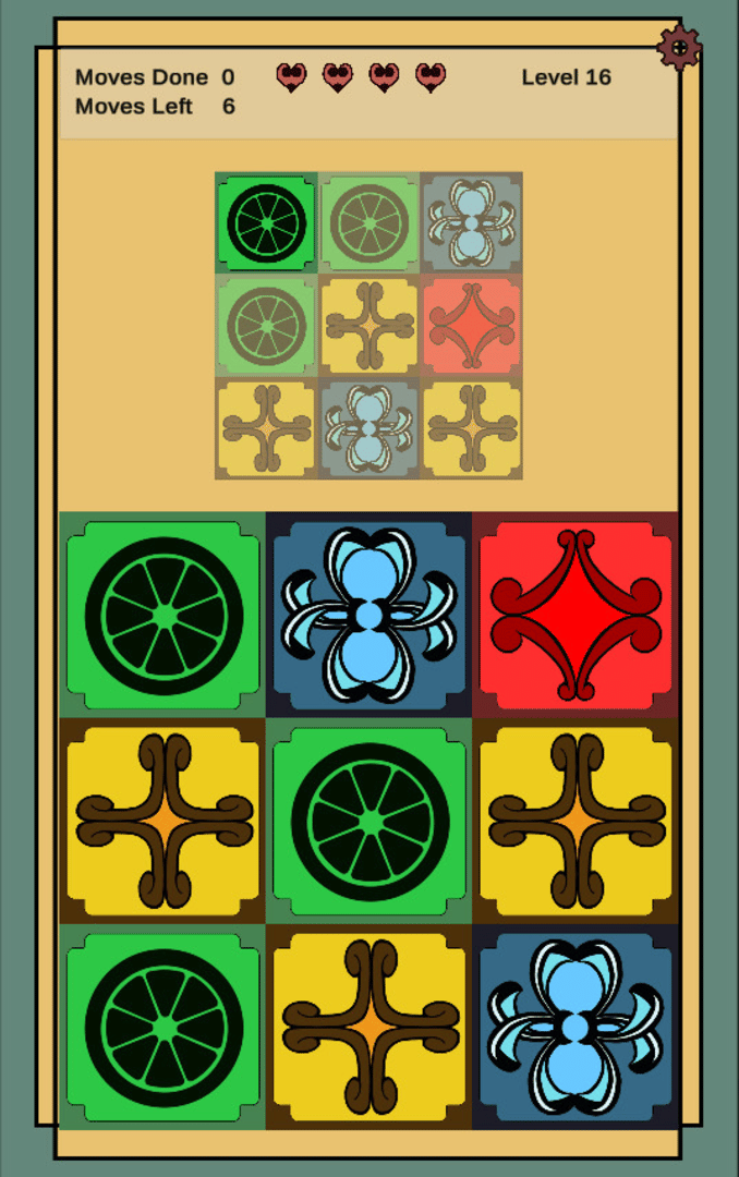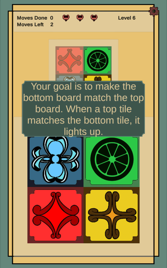 Quarres ("squares" in Middle French) is a 2D puzzle in which your goal is to match the tiles in your board with the pattern on a sample board.