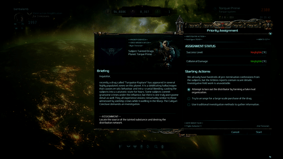 The spread of Warp-tainted drugs has been reported amongst the populace, with potentially grave consequences for the stability of the affected region. The threat level is still debatable, but the Imperium cannot take risks on matters like this.