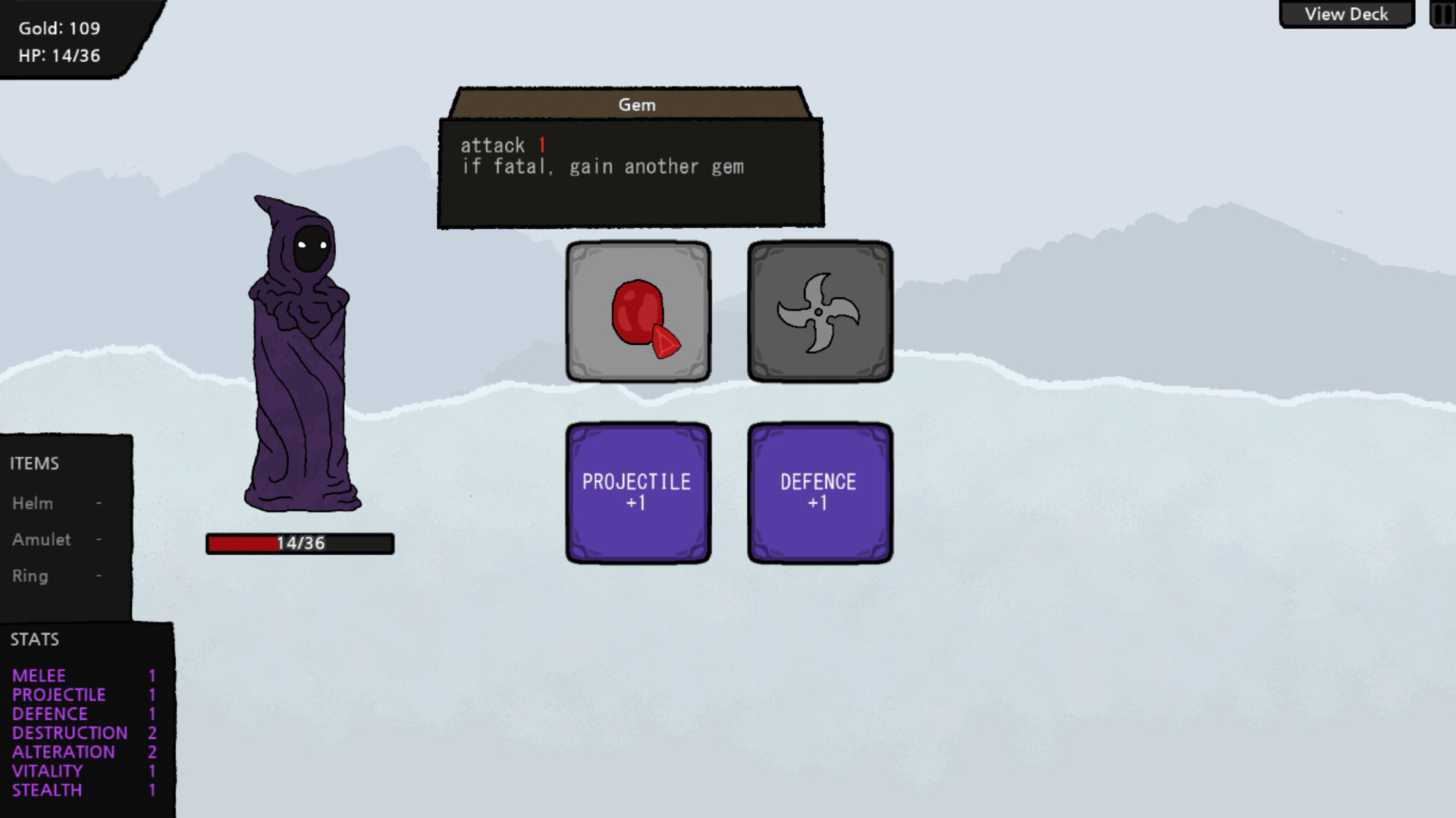 Pick-up-and-play Deckbuilder with lots of synergistic depth. Slice through undead foes, and Level-up your 7 STATS. Synergize your STATS with your cards to maximize their effectiveness.