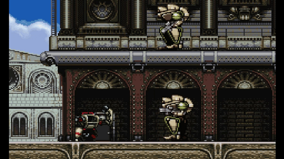 Gun Hazard is a side-scrolling shooter with strong RPG elements, and a spin-off of the Front Mission series. Gameplay is more than a little similar to Cybernator or Metal Warriors. The player moves between different stages on an area map. Once inside a stage, the player controls Albert and his wanzer as it moves left, right across the screen. The wanzer is able to jump, and attack with a primary and a special weapon. At any time during a stage, Albert can eject from his heavily armed wanzer to explore. Although vulnerable when outside, Albert is able to reach areas the wanzer cannot, in addition to being a smaller target and being able to jetpack indefinitely. Money and experience are earned through the completion of mission objectives as well as the kill count of enemy wanzers. Additionally, Albert can recruit other characters through the normal course of the story, some of whom can be designated to support roles. These support characters when set can provide a variety of different cover fire abilities for Albert during his missions. They too gain experience and levels. Different weapons and armor can be found or bought. Essential components include the Booster ability which allows the wanzer to hover and increase its jumps, as well as the Dash ability which allows quick left-right movement by the wanzer.