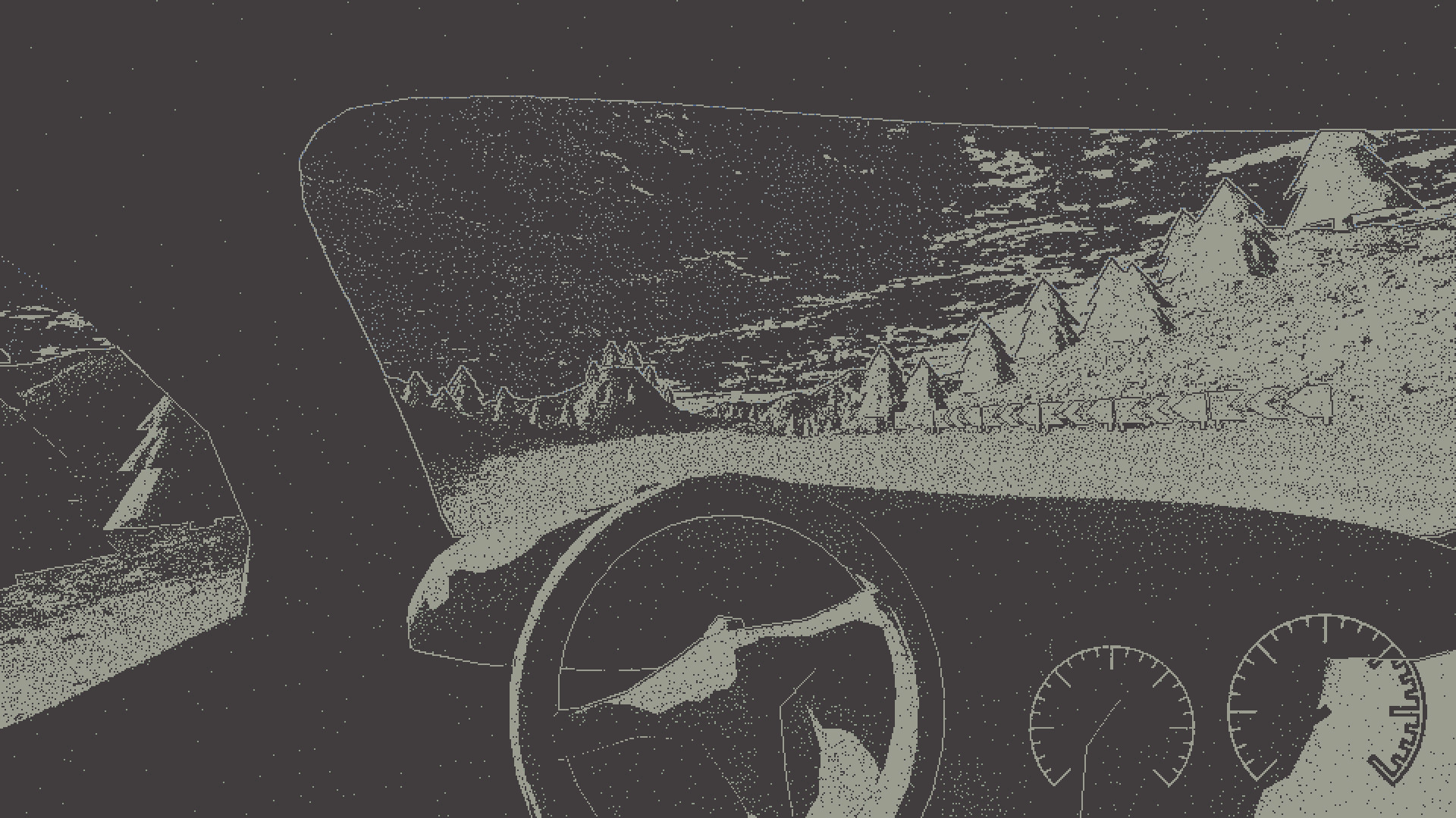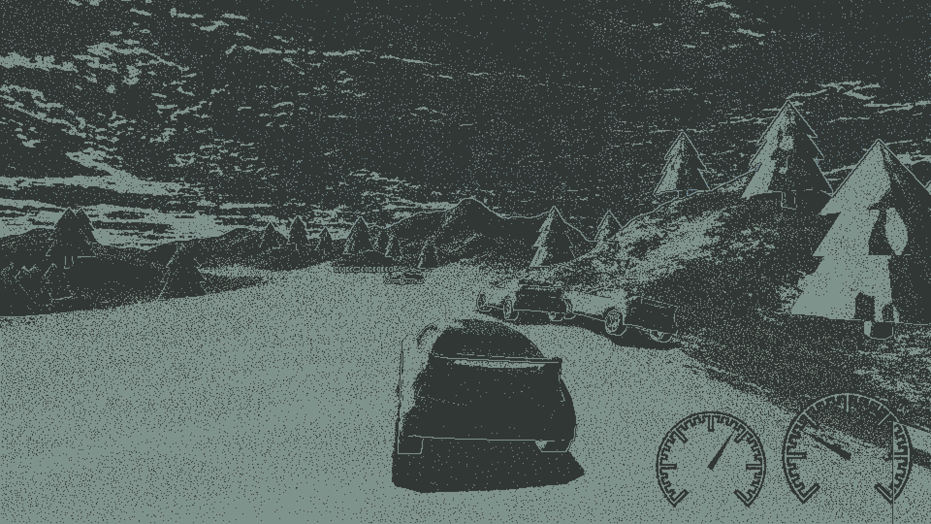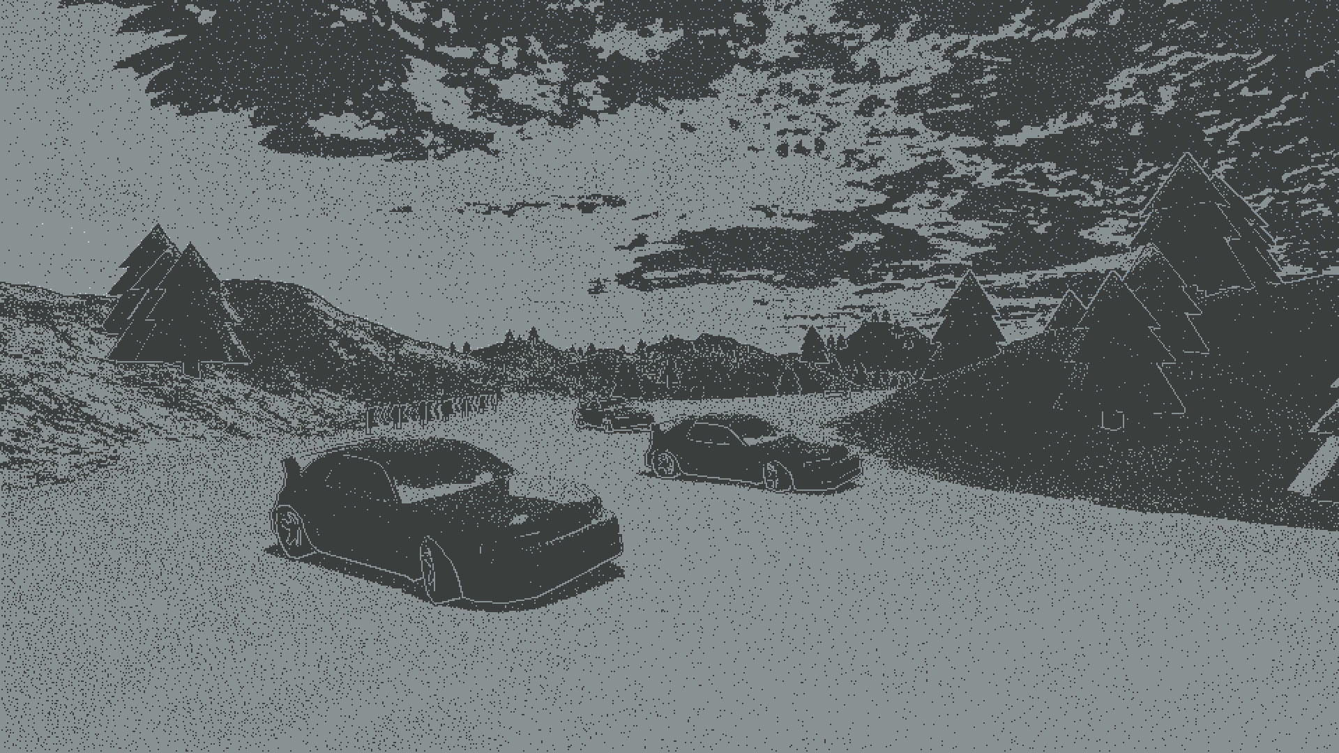 Indie racing features on-the-fly generated challenges, fake car physics for fun casual playing and custom 1-bit 3D pixel-perfect dithering visual style.