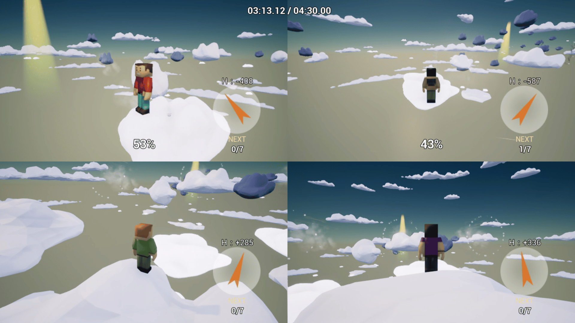 Ride on a cloud, fly freely in the sky. Just stand on the cloud and you can control it by changing your position. dodging various obstacles, reach the goal in limited time. Support up to 4 local players racing in splict screen mode.