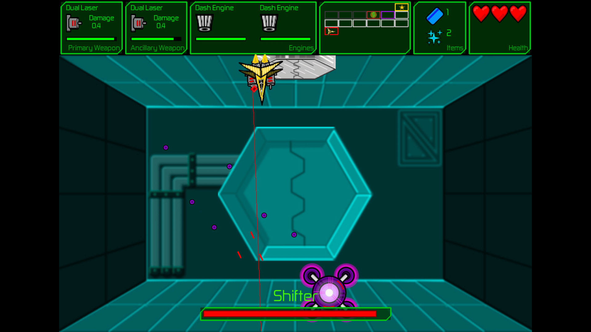 Starshot is a difficult space shoot-em-up with rogue-like elements and randomly generated levels. Will you be able to upgrade your ship and pilot it to safety, or be destroyed in your search for stardust inside the automated production facility?