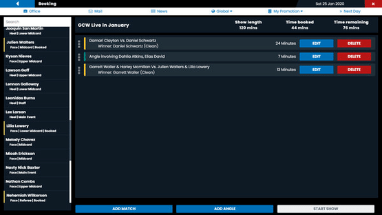 Pro Wrestling Sim is a text-based pro-wrestling booking simulator. Control a wrestling promotion, decide your roster, and create storylines, feuds and matches where the winners and losers are in your hands.