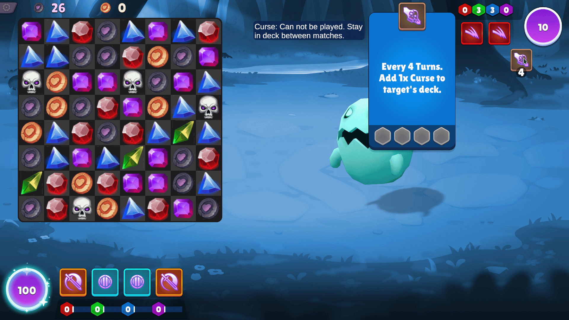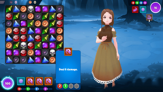 A naughty single player deck builder rogue-like with match-3 puzzle mechanics. Collect cards to make your deck stronger and coins to buy potions and unlock new cards while working your way through matches against cute monsters and anime girls. Use the match-3 puzzle mechanic to collect mana/energy to play cards from your hand. Beware, your opponent is also collecting tiles in their turn and could be grabbing that colour match you were waiting for. Reach the end of a run to unlock the gallery of that character and play with her using your "special" cards.
