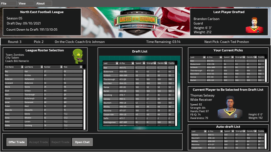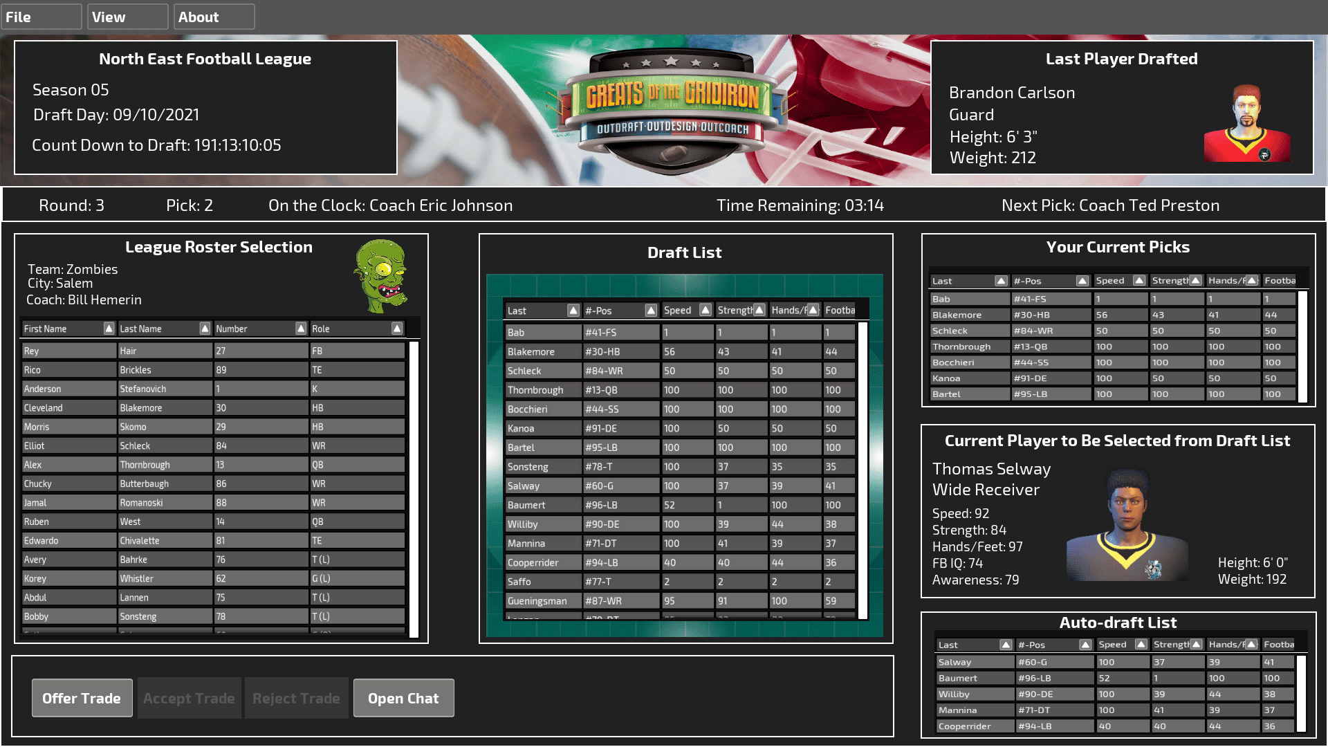 Greats of the Gridiron is a football simulation experience where must Outdraft, Outdesign, and Outcoach other coaches to stake your claim to Greatness.
