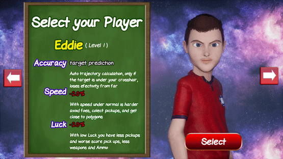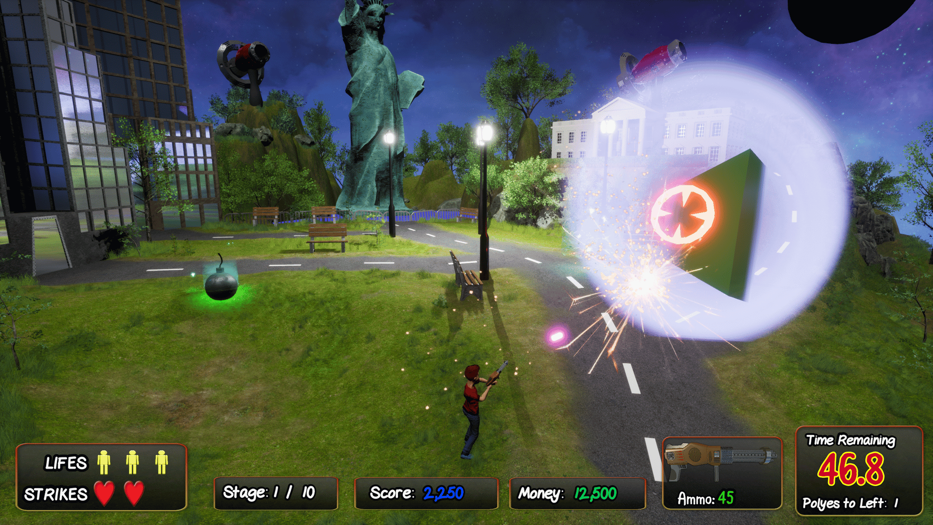 Eddie is a student that falls asleep at Geometry Classroom and faces all those Polygons the teacher is drawing in the whiteboard in their dreams, to do this he has an energy weapon with unlimited ammo and the support of pickups with various effects and weapons. Defeat wave after wave and pass across levels based on countries of the world.