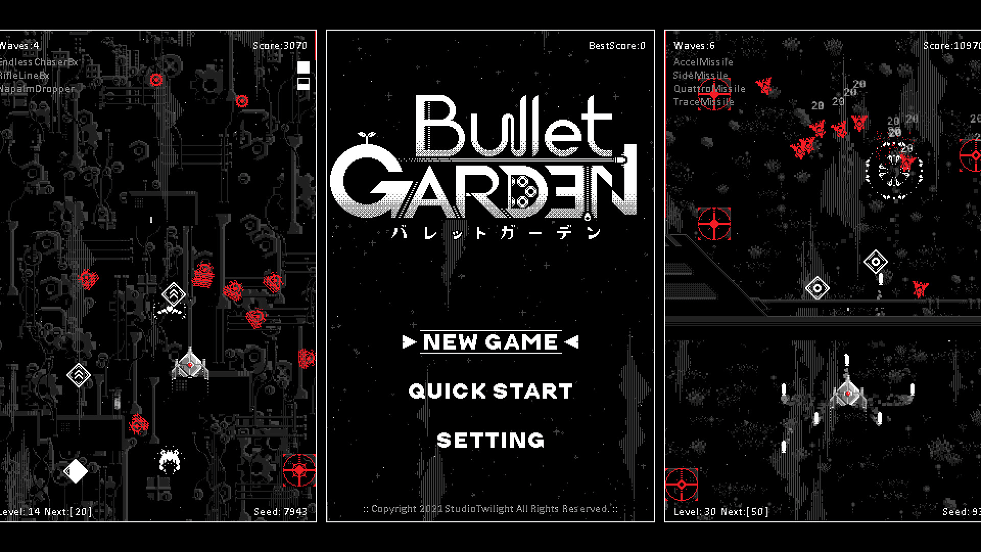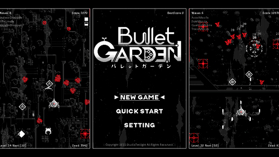 BulletGarden is a 2D vertical shooting gamewhere you explore a planet where the seeds you sow blossom into weapons.You can handle about 300 different types of weapons,each with its own unique characteristics.