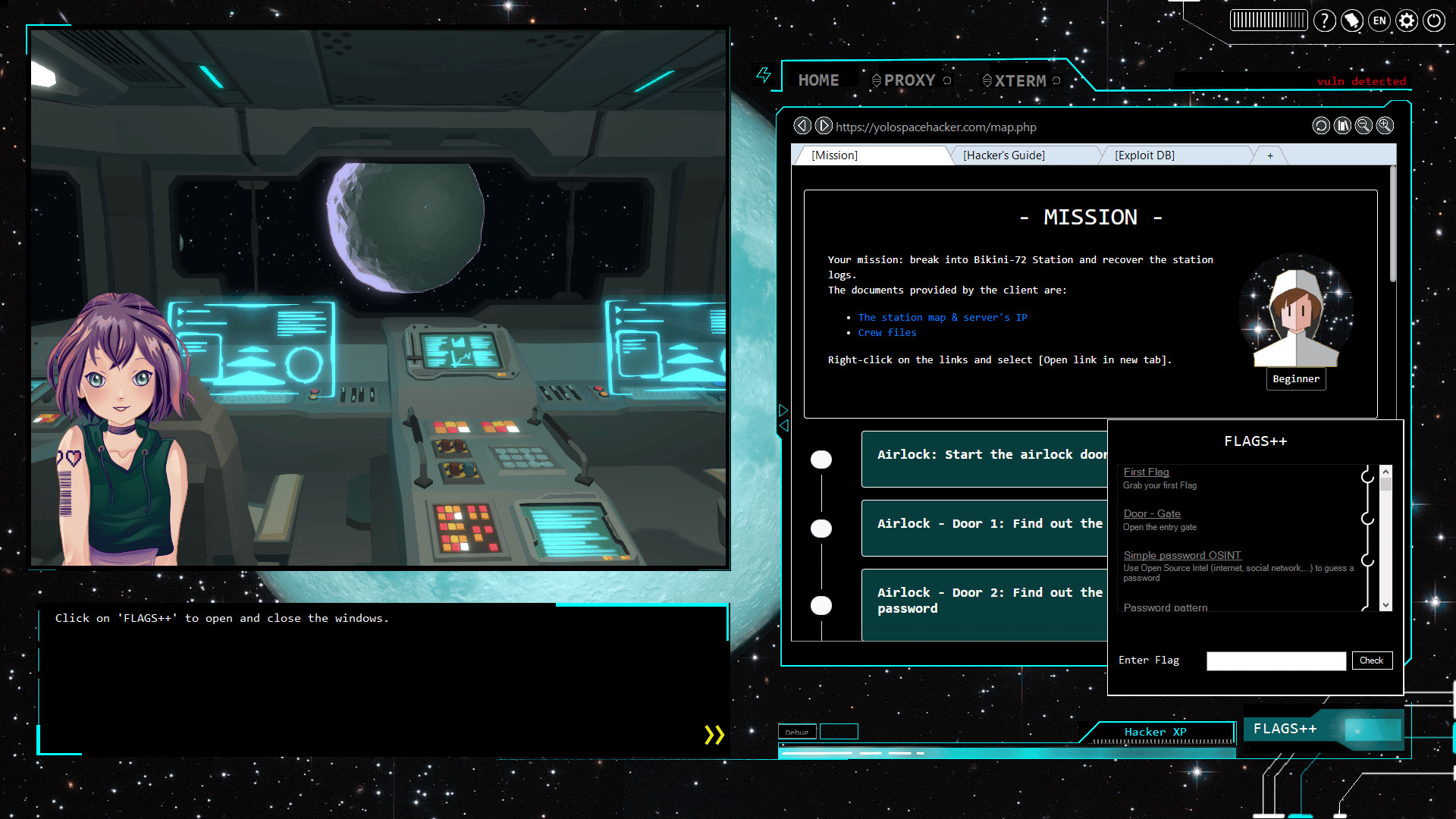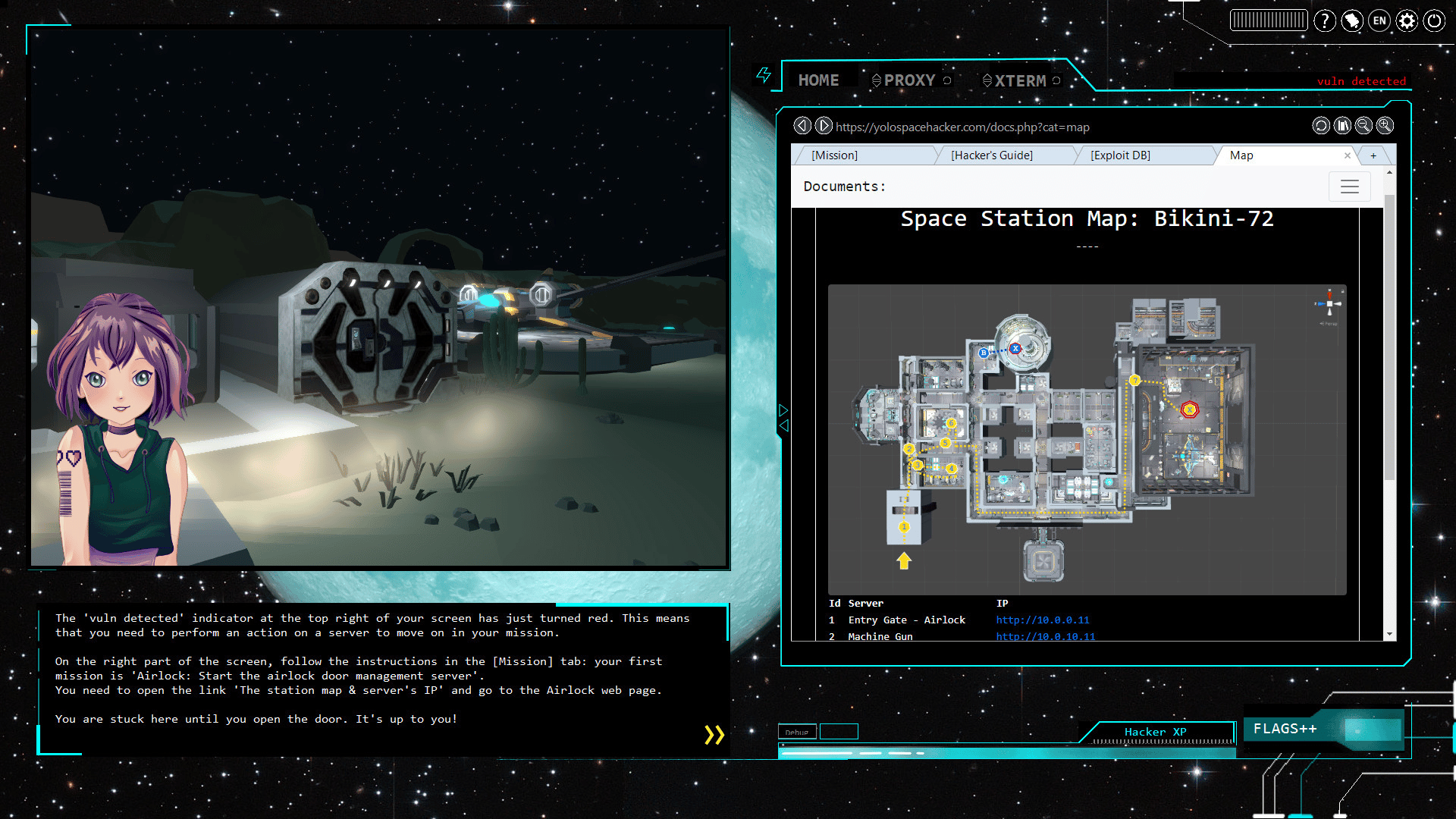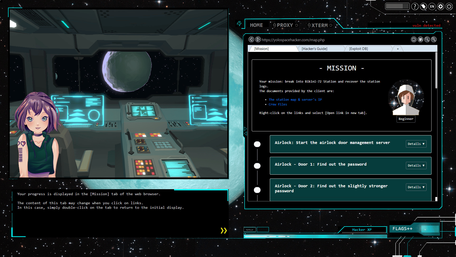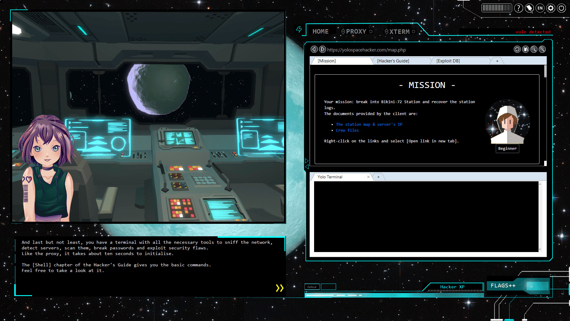 Welcome to our ethical hacker's organisation: we will teach you how to use actual hacker tools (terminal, proxy, reverse shells...) to scan the network, crack passwords, bypass server security and solve the mystery of the Bikini-72 space station.