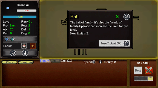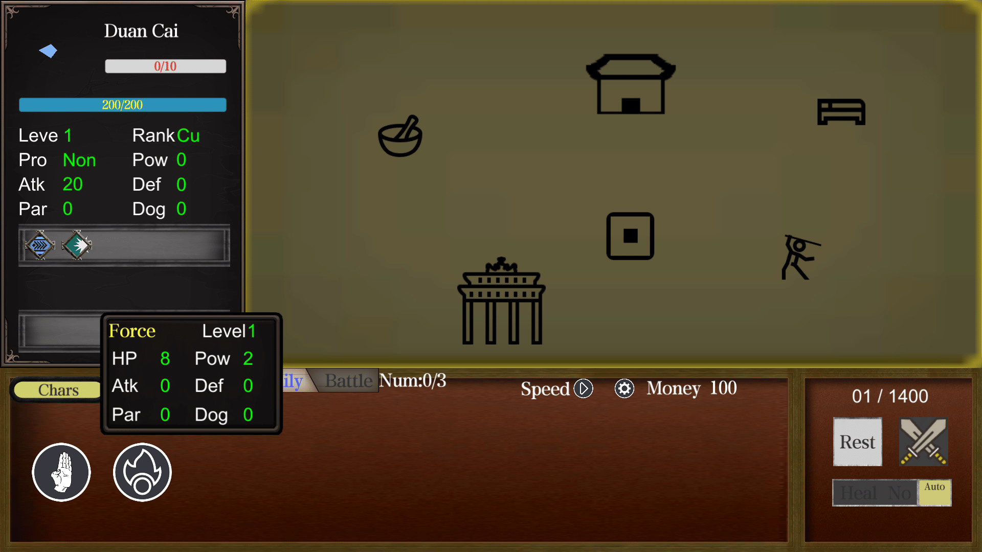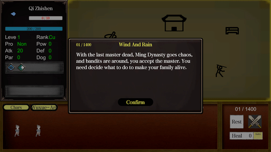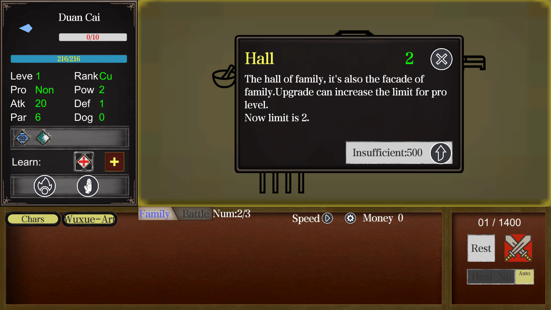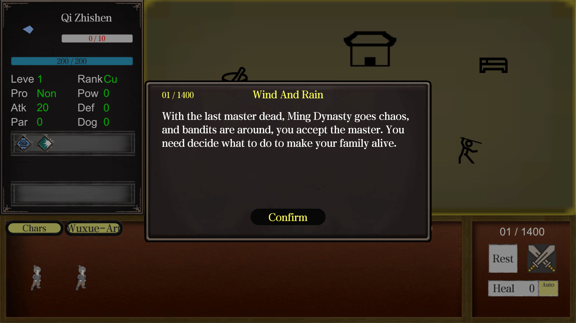 Playing as a master and taking over a wulin-family in the end of the Ming Dynasty. You can: Build your family; Acquired the Wuxue-Arts; Recruit disciples; Make different choices in different events; Improve the master's skills after each game time;