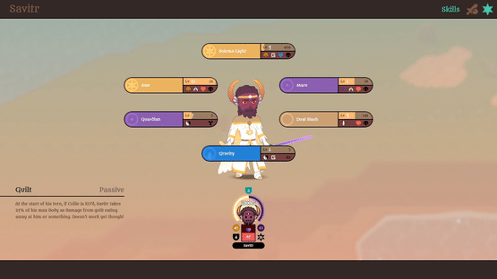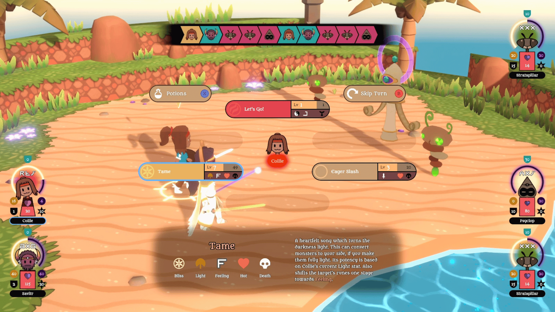 An immersive, idiosyncratic RPG. To atone for past sins and bring light to his godless world, a holy knight and his tamed-bandit apprentice quest through their dreams, facing turn-based battles against monsters made of dark thoughts that they can either destroy or tame into temporary allies.
