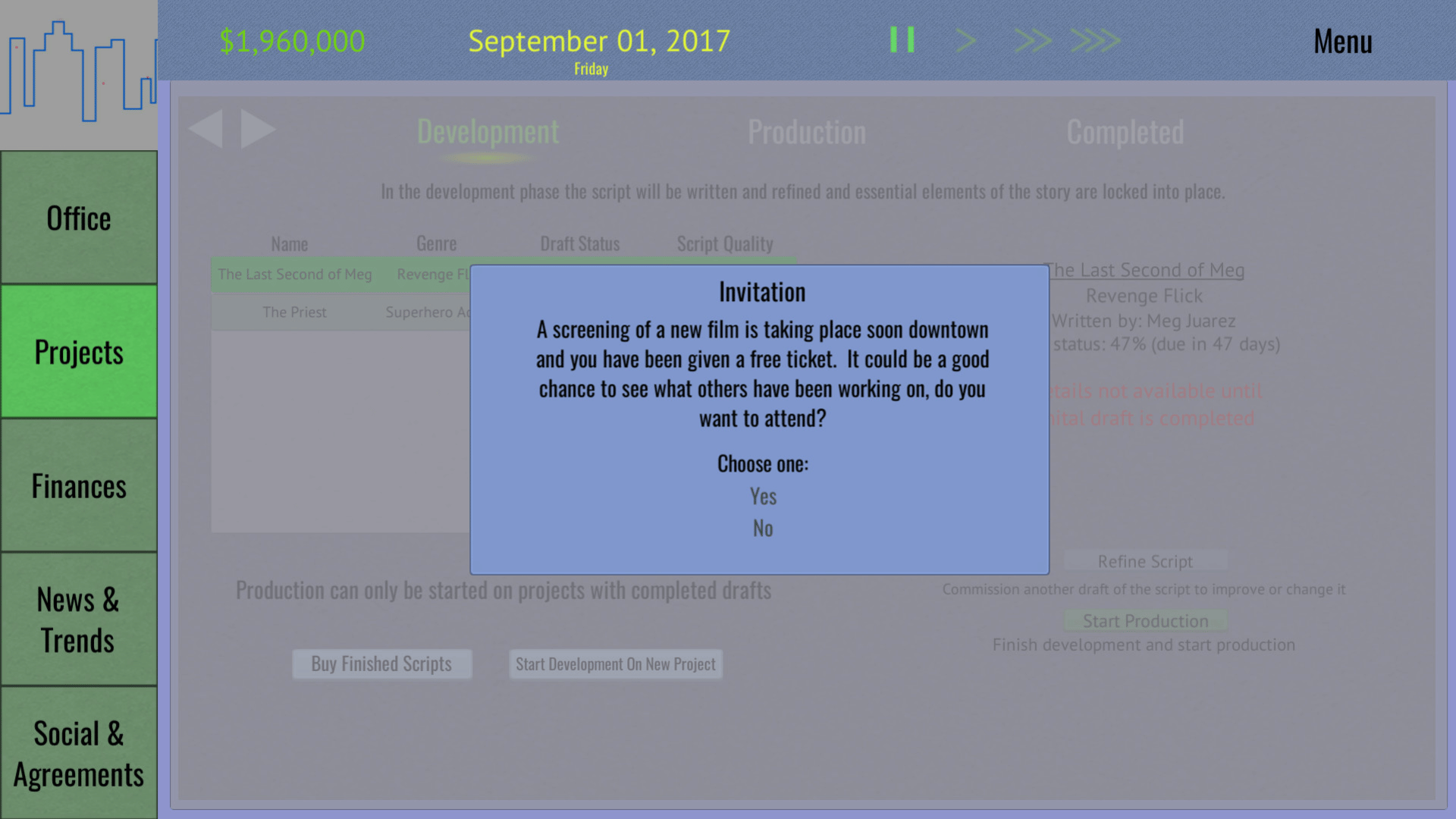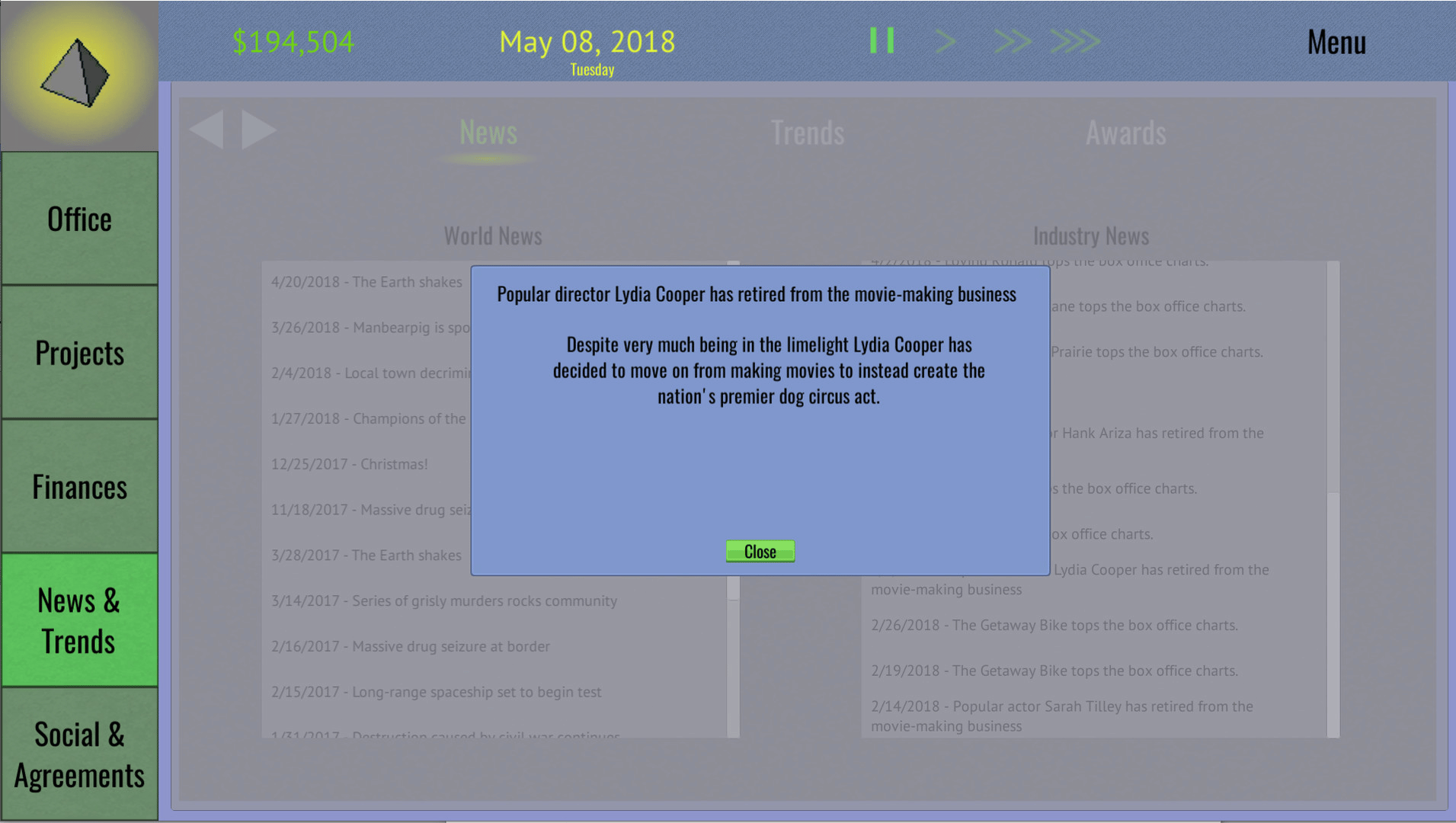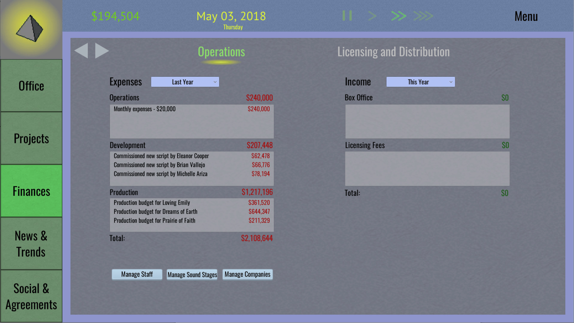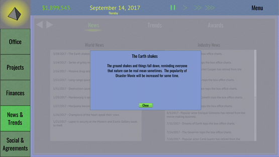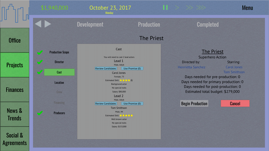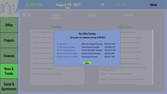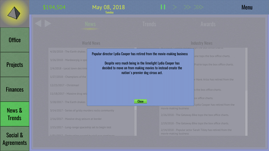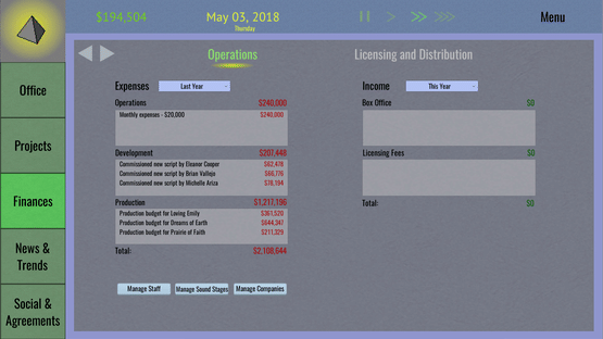 Tinseltown Tycoon is a management and simulation game that puts you at the head of an obscure film production studio. With control over all aspects of studio operations and the movie production pipeline you can lead your studio to industry domination, financial ruin, or anything in between.