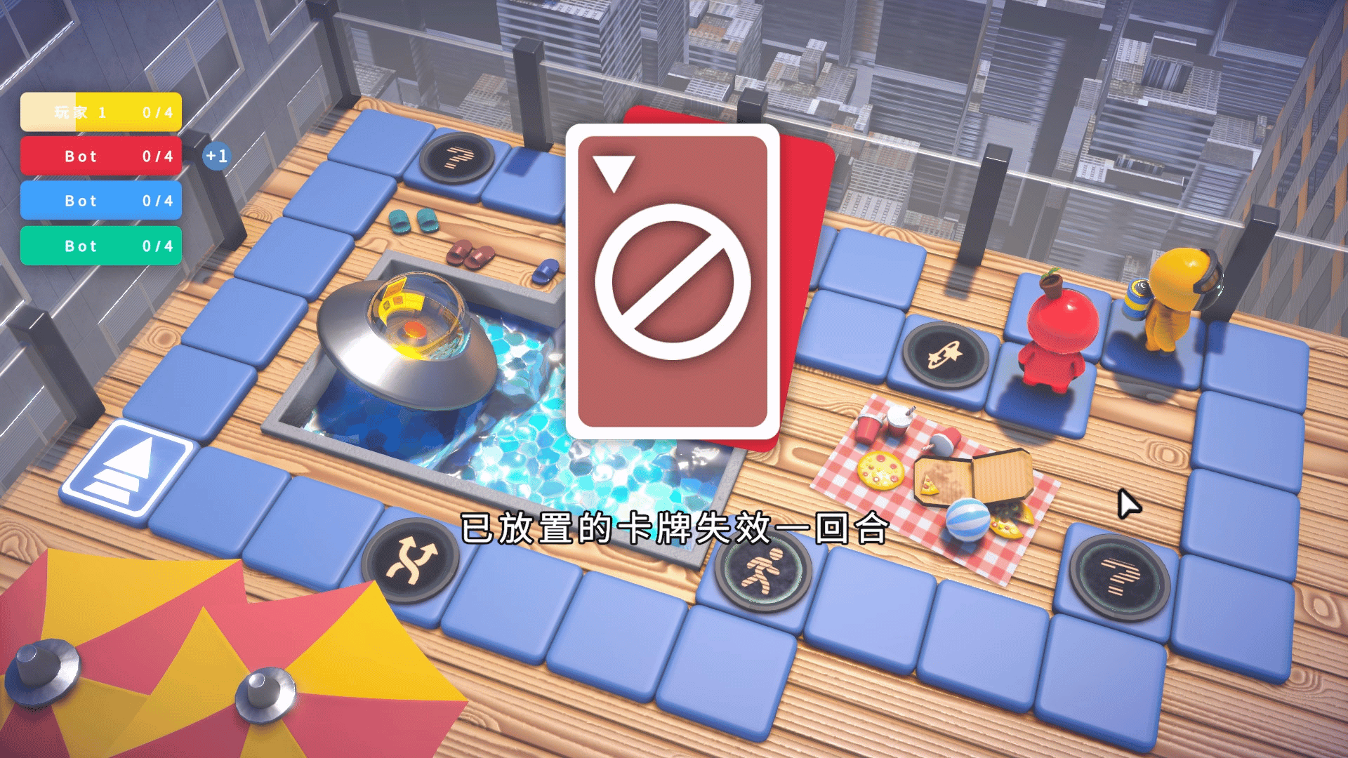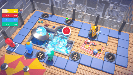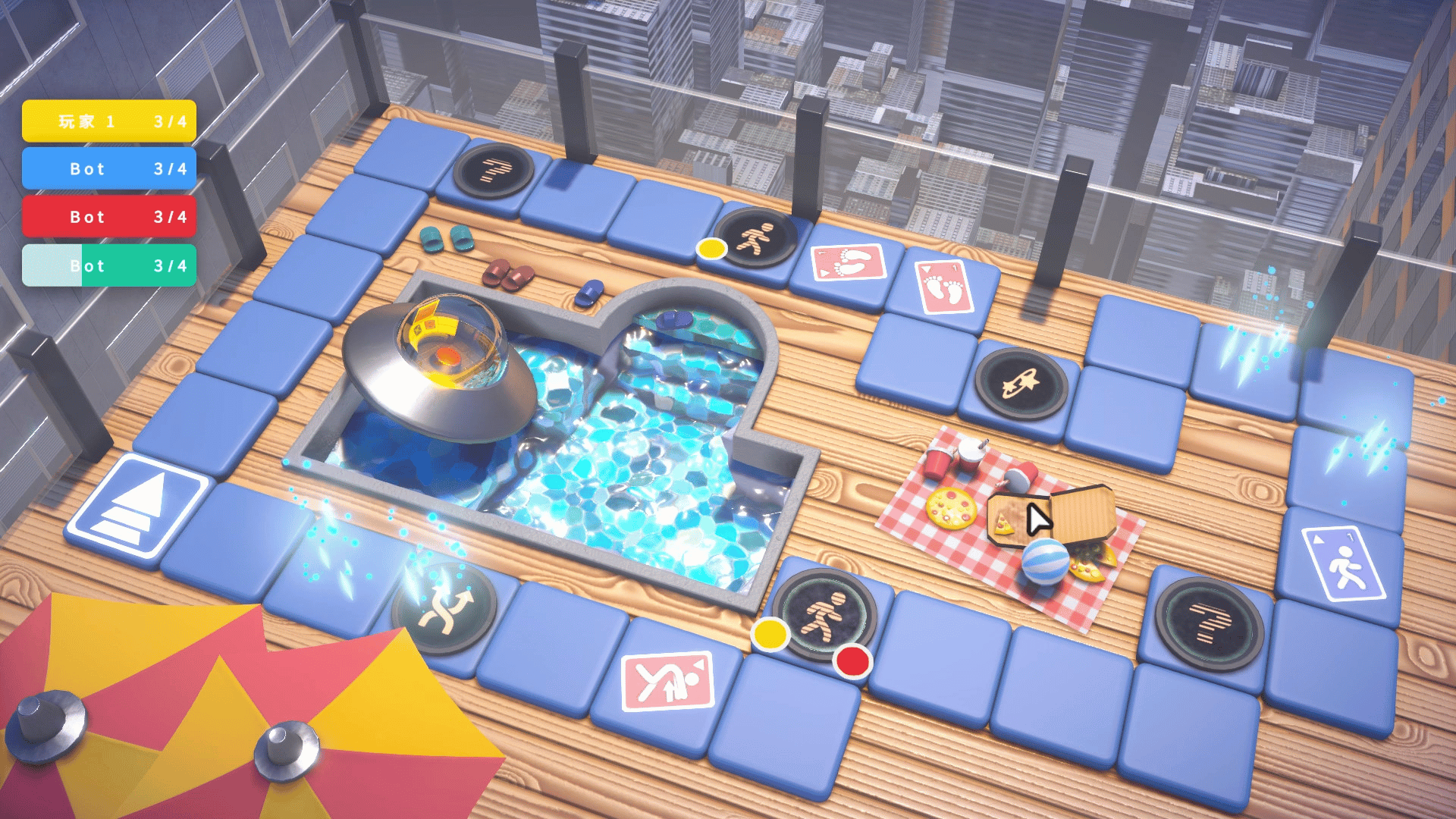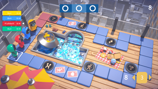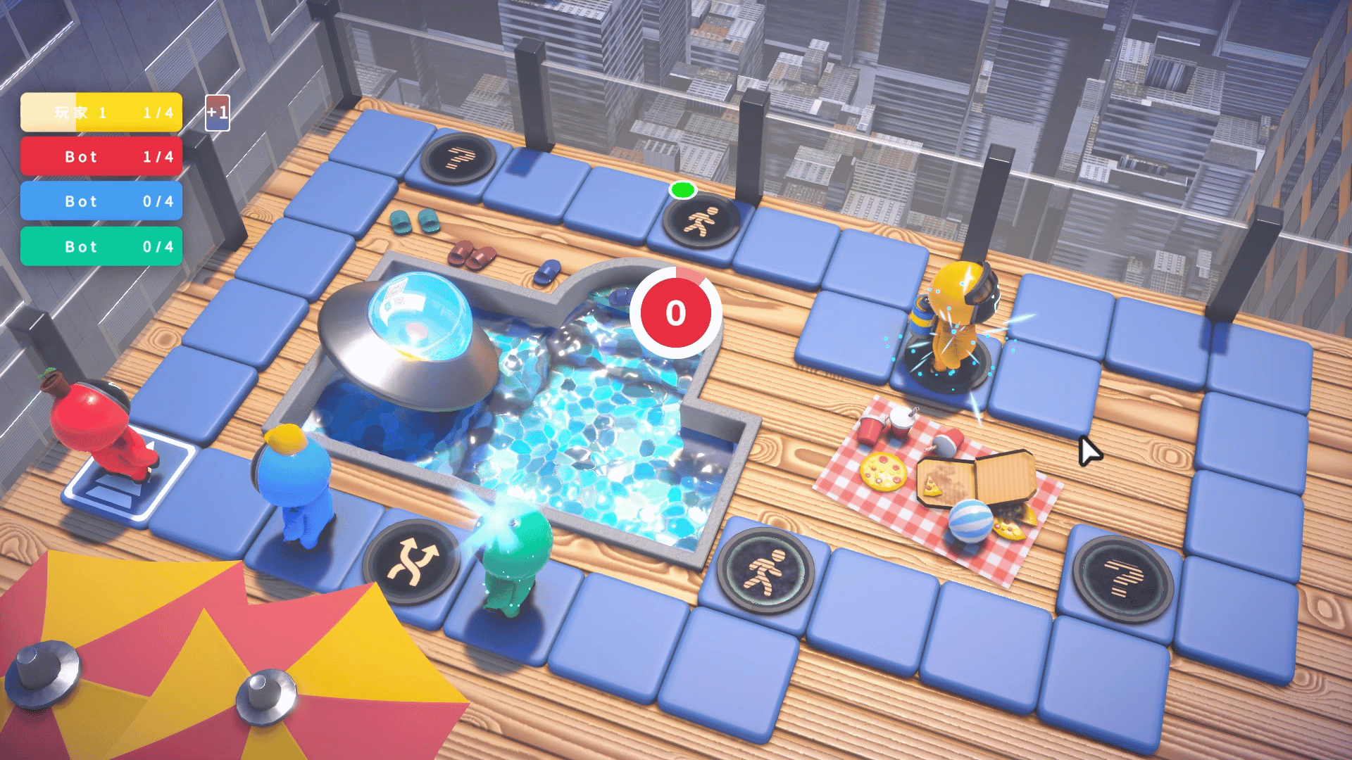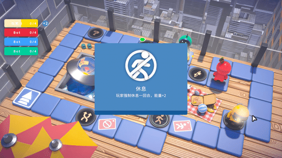 This is a board game. Your goal is to defeat your rivals and win the battery. Then you can get on the UFO.