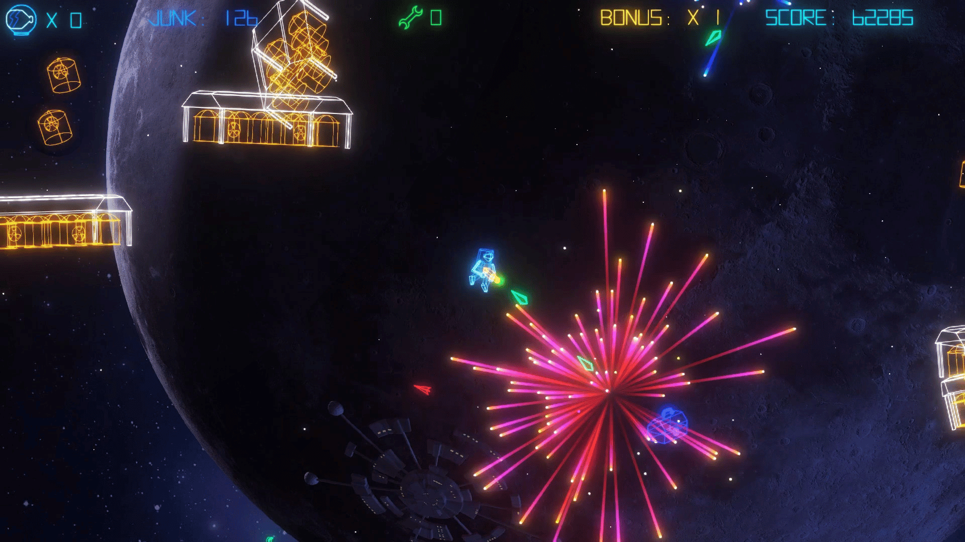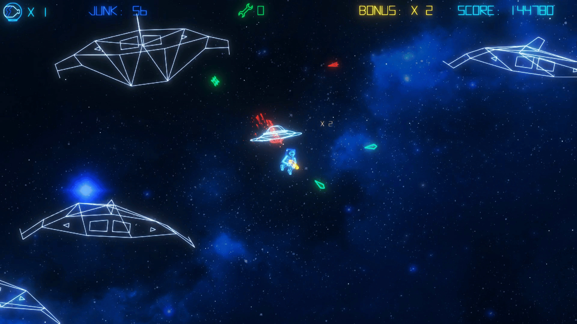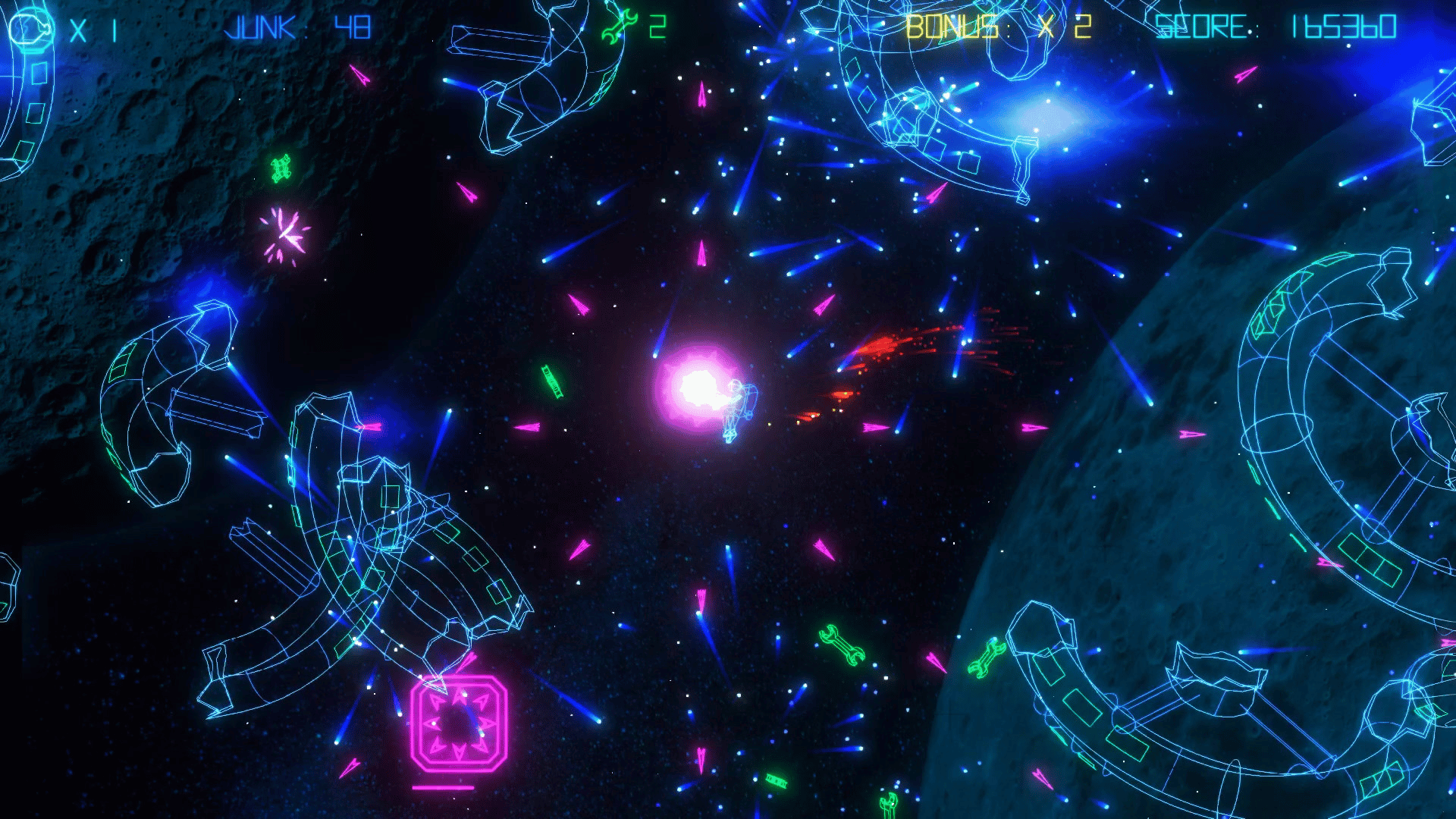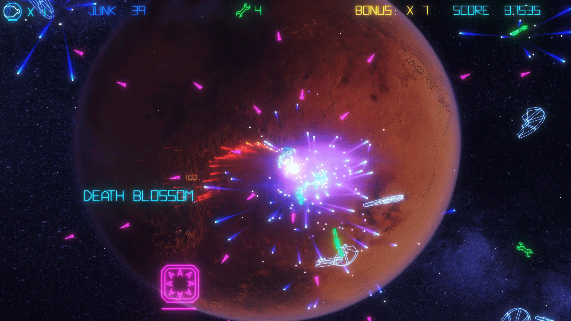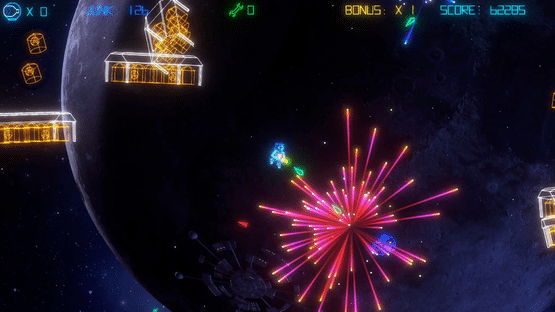 Intense action, retro-styled visuals, a sizzling synth soundtrack and tons of cool Sci-Fi references, all rendered in vibrant, neon graphics. Get your trigger-finger ready, turn the lights down, the sound up, and blast your way through level after level of fast paced, Junk smashing action!