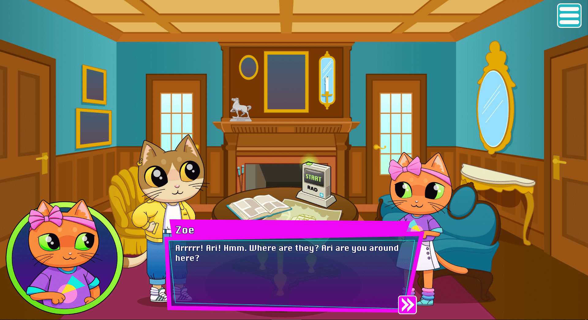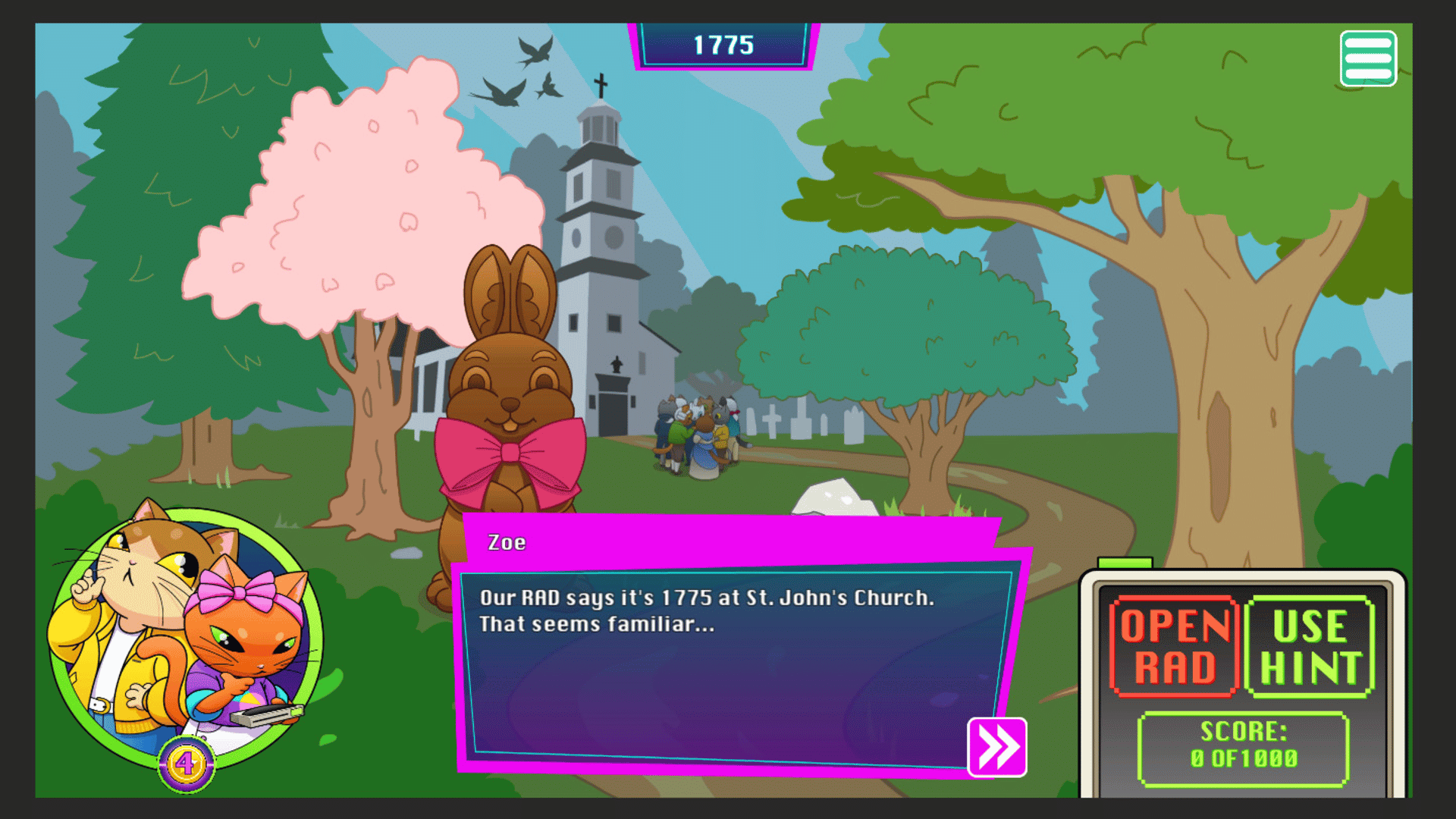 Visit the American Revolution with two time traveling cats from the 80's! Help Ari and Zoe fix glitches in time to help save the American revolution! This short point and click adventure helps players learn the basics of 3D coordinate systems used in game development software like Unity.