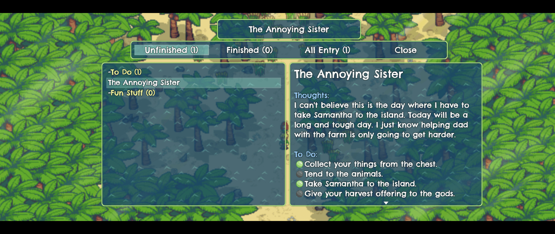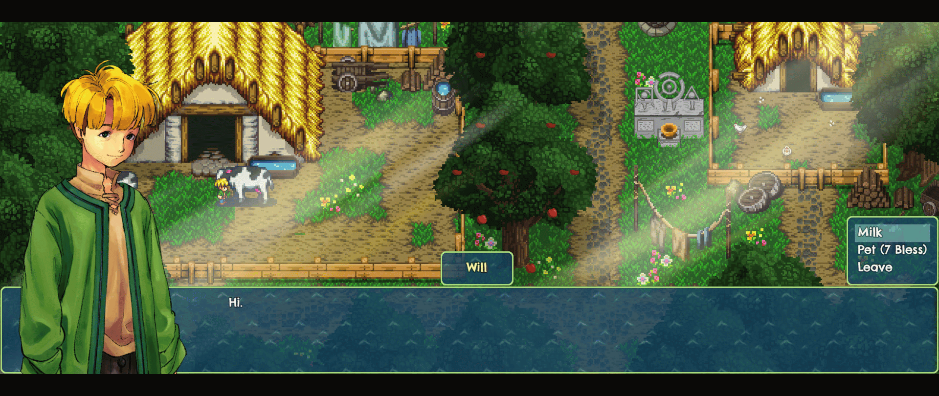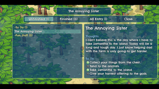 Play the first chapter of Harvest Island, an upcoming pixel-art, cute, semi-farming simulator set on a remote island. Take on the role of Will and help your sister catch a raccoon to offer to the gods. Inspired by Stardew Valley, Harvest Moon, and Rune Factory.