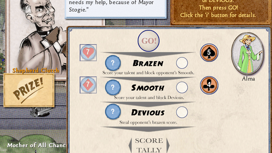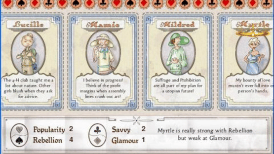 Explore four beautiful game boards, dozens of character cards, and thousands of dialog cards (worn and aged from decades of neglect) which comprise the zany world of an American small town in the 1920s. Encounter nearly a hundred individual personalities. These denizens form the core culture of intolerance and repression your girls can overcome with wit, charm, and brazenness.