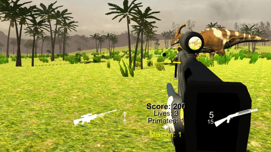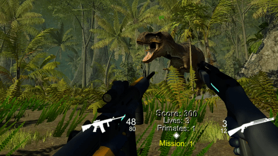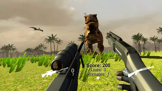 Enjoy hunting dinosaurs and protect primates in a Virtual Reality game. Dangerous T-Rex, Spinosaurus, Raptor, Triceratops, Brachiosaurus, Pteranodon, Stegosaurus, Dimetrodon, Paradophosaurus. With weapons and missions !