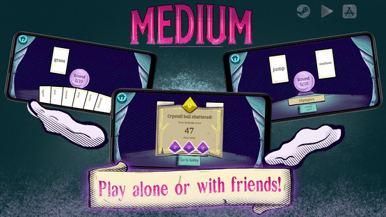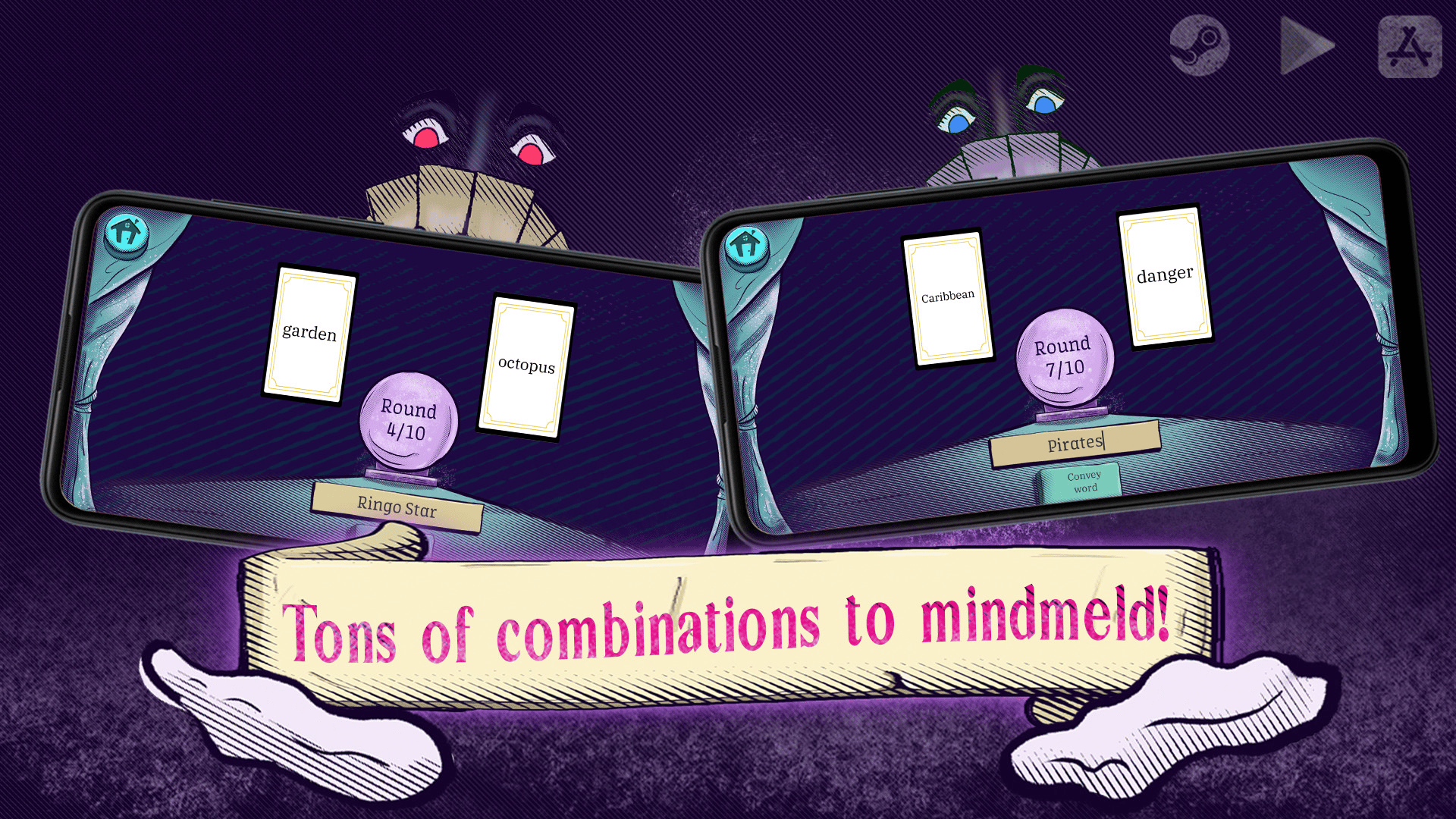 In the game Medium, players act as psychic mediums, harnessing their powerful extra-sensory abilities to access other players’ thoughts. Together in pairs, they mentally determine the Medium: the word that connects the words on their two cards, and then attempt to say the same word at the same time!