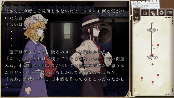 東方Projectでおなじみ、上海アリス幻樂団様制作の音楽CDシリーズ「秘封倶楽部」の二次創作ノベルゲームです。選択肢はありません。物語中で入手した記憶の欠片「フラグメント」や、プレイヤー自身の知恵によって物語を分岐させ、彼女達の冒険―蓮台野夜行―を成功に導きましょう。