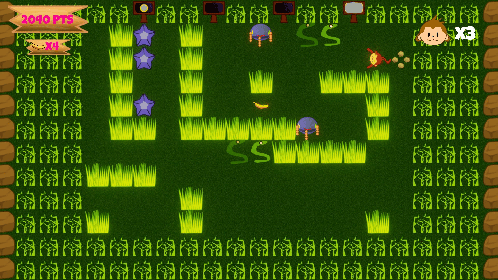 The forest was invaded by an army of robots! Use your skill to help Monkee, Donkee, Tinkee and Pinkee save the day. Metal Banana brings classic elements of arcade games in a new title full of action and colors.