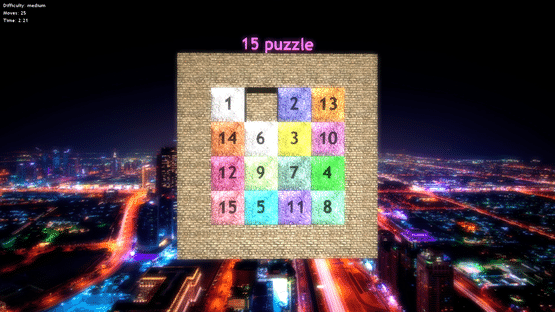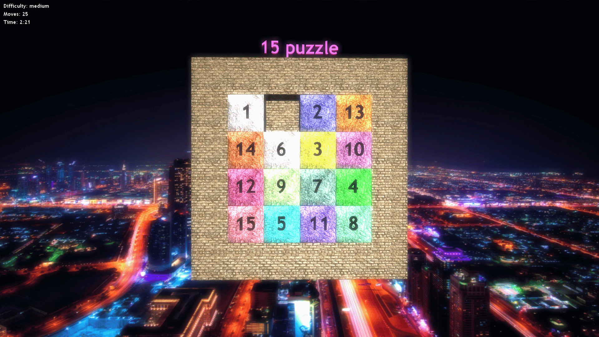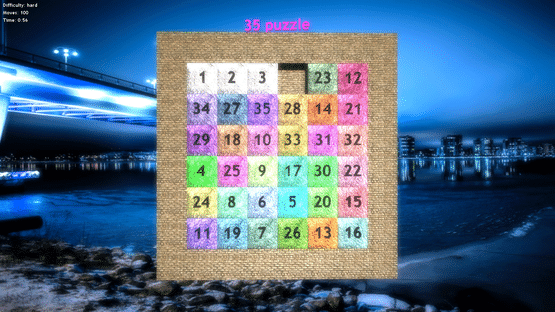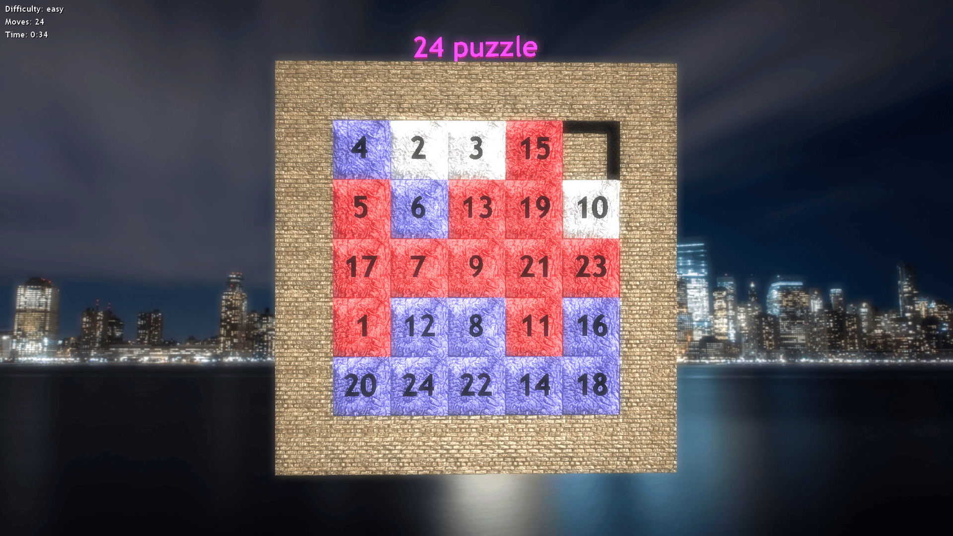 A classic game of puzzle 8 (3x3), 15 (4x4), 24 (5x5) or 35 (6x6) in which player has to move pieces on board so they are from 1 to 8, 15, 24 or 35.