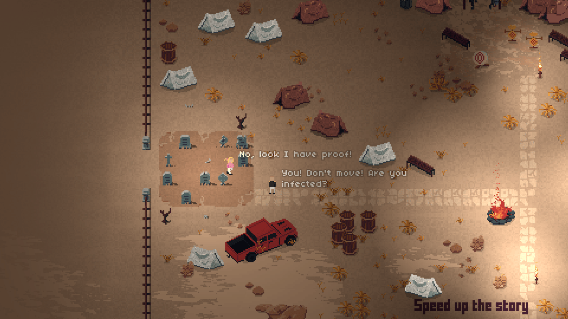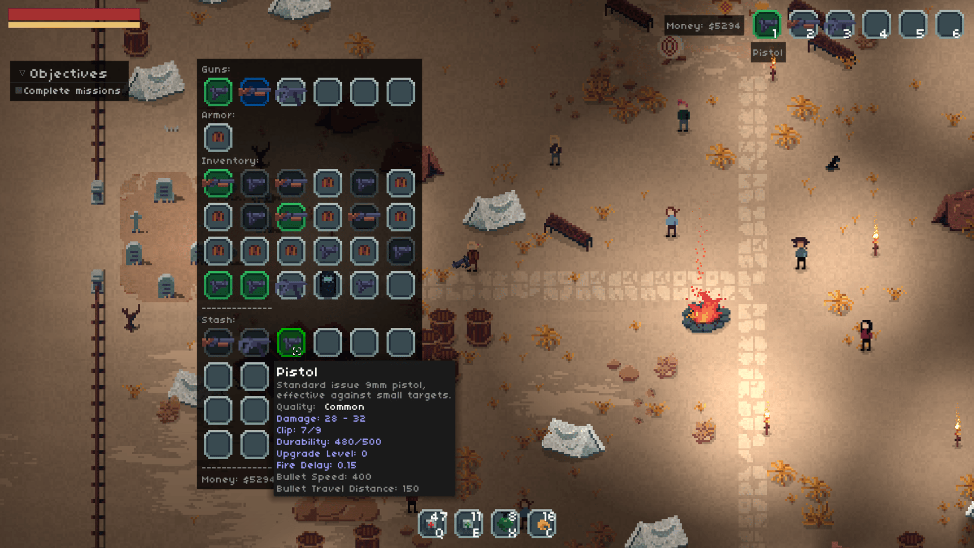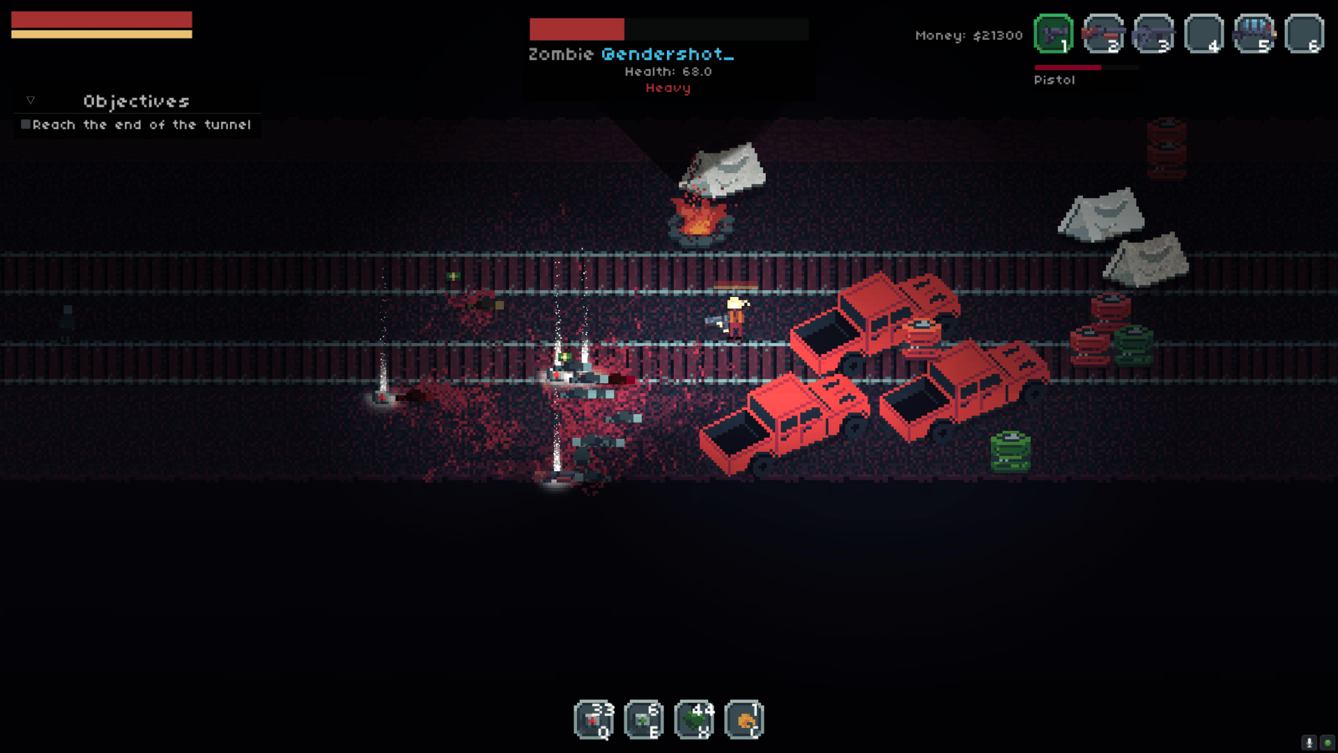 Bitgun is a top-down shooter with a lot of blood and zombies. Burn zombies with a flamethrower, shoot them in the face with a sniper rifle, or go berserk with a shotgun! Make sure you bring enough guns because they will break quickly while you go on missions and kill hordes of zombies. You will be dodging zombies that are crawling out of the ground and jumping at you. If you die while fighting your way towards the zombie boss you will lose all your gear. In a world where people are fighting among themselves as well as against hordes of zombies nobody trust anybody now, and people are afraid of getting infected. Penny is traveling alone to find a safe place, and soon she lands in a small camp in the middle of nowhere. Maybe this is her chance to find a home?