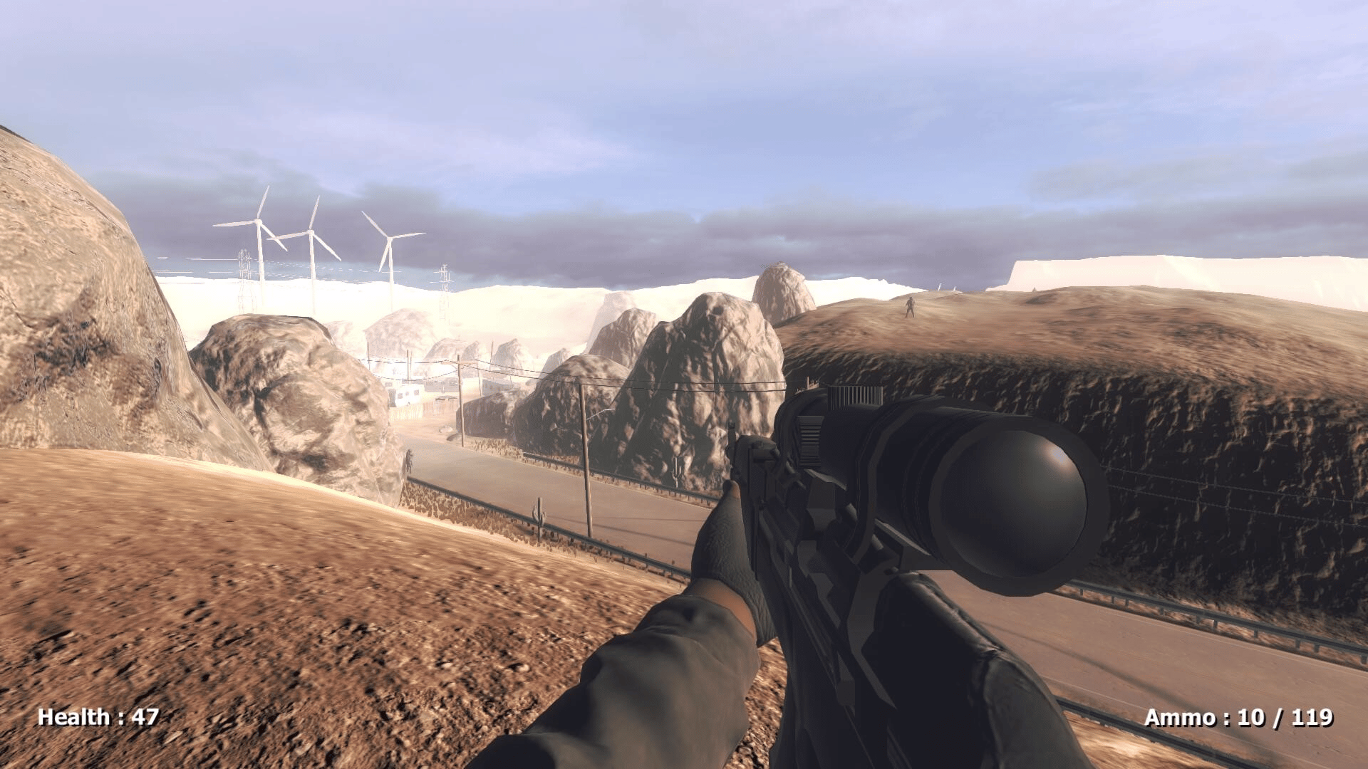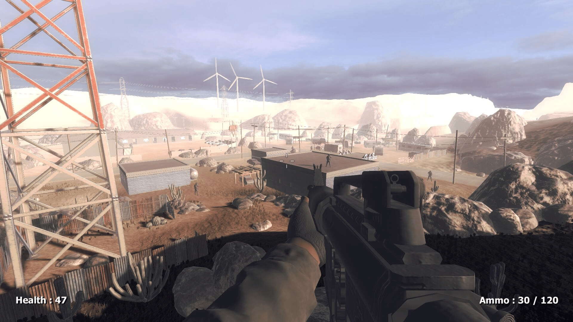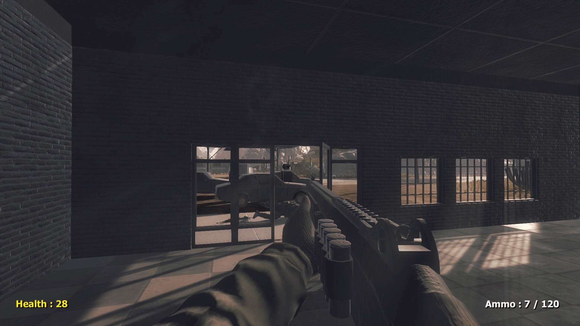 This is a first person action shooting game,Players are free to explore their surroundings,Players are surrounded by enemies. Players can kill enemies or avoid enemy attacks ,After killing the enemy, you can pick up the enemy's weapons,Players need to keep their health as long as possible.
