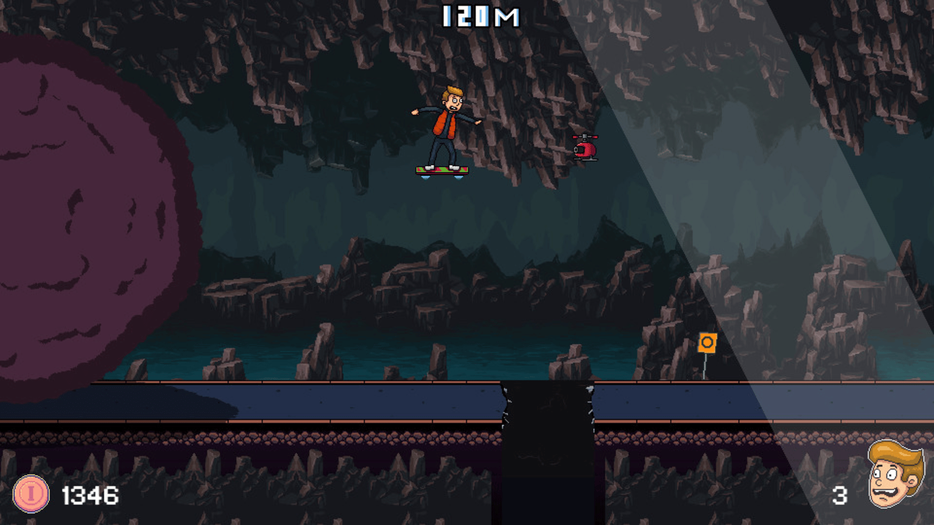 Running Marty-Runner about the incredible adventures of Marty caught in different dimensions. Control Marty on a hoverboard, dodging various obstacles by jumping. You can upgrade your hoverboard for accumulated bonuses.