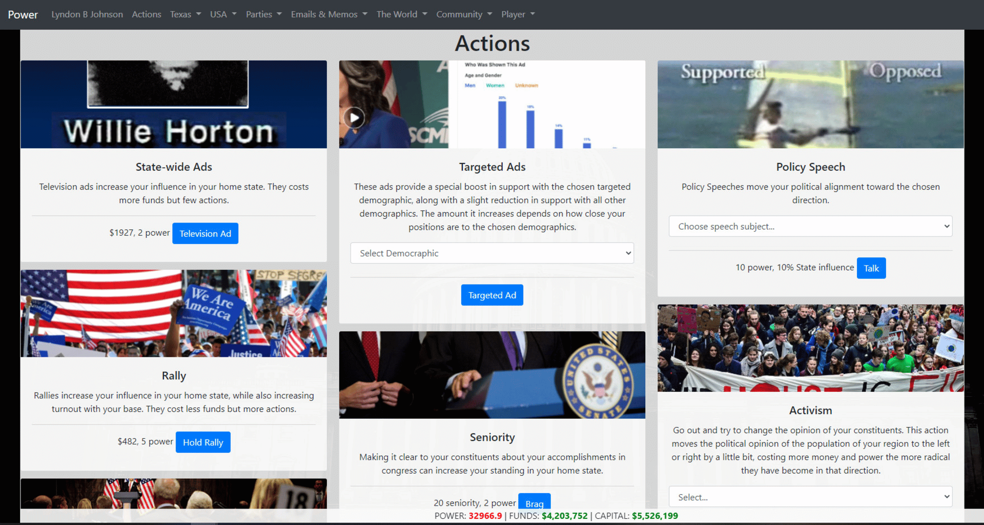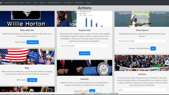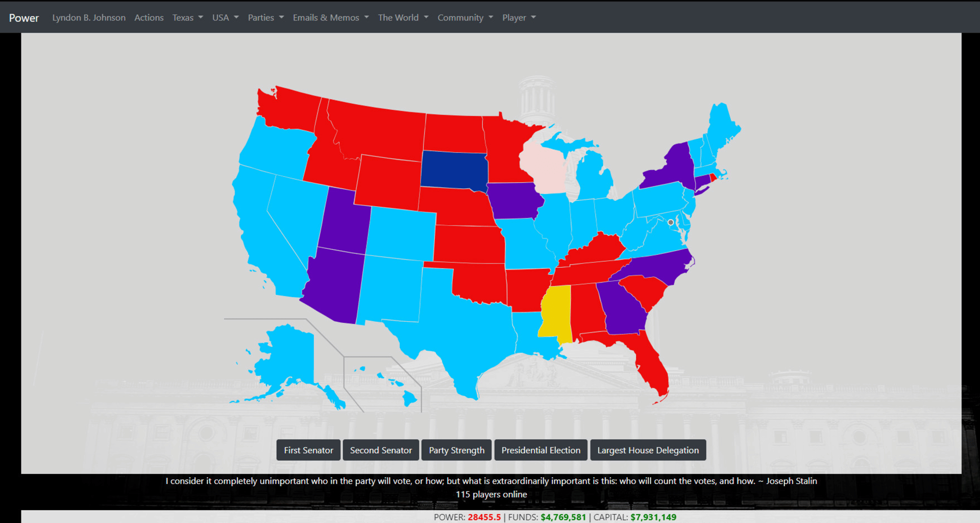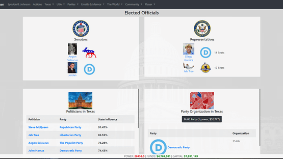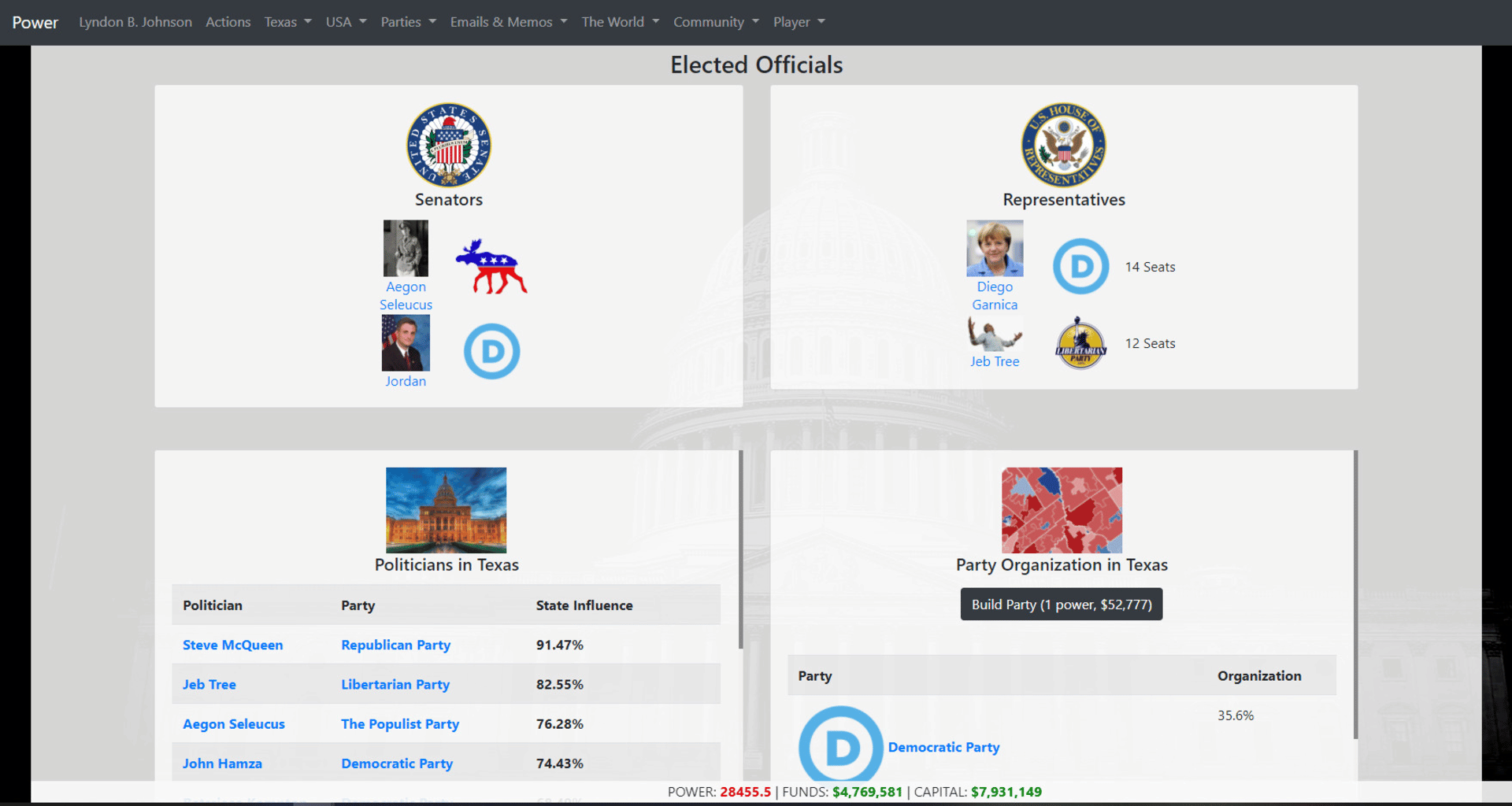 Power is a global political and economic simulation game where you can play as a powerful politician or businessman in a number of detailed countries. Starting from nothing, you can seize the highest offices in the land through free and fair elections, or dirty tricks and deals.