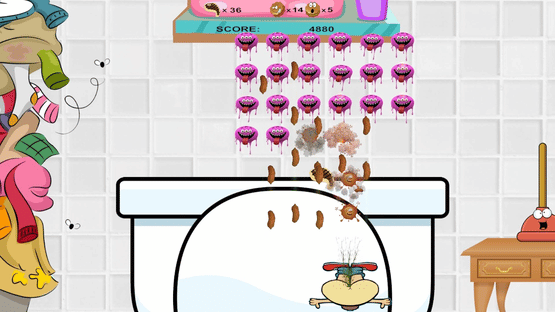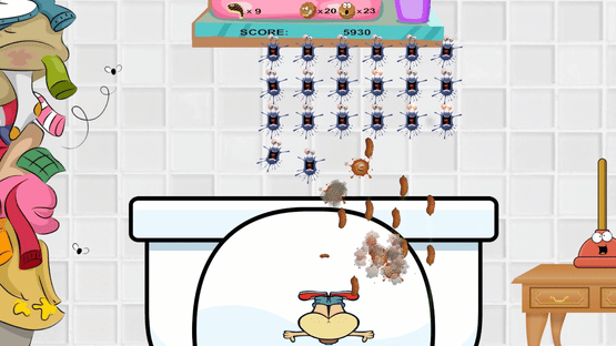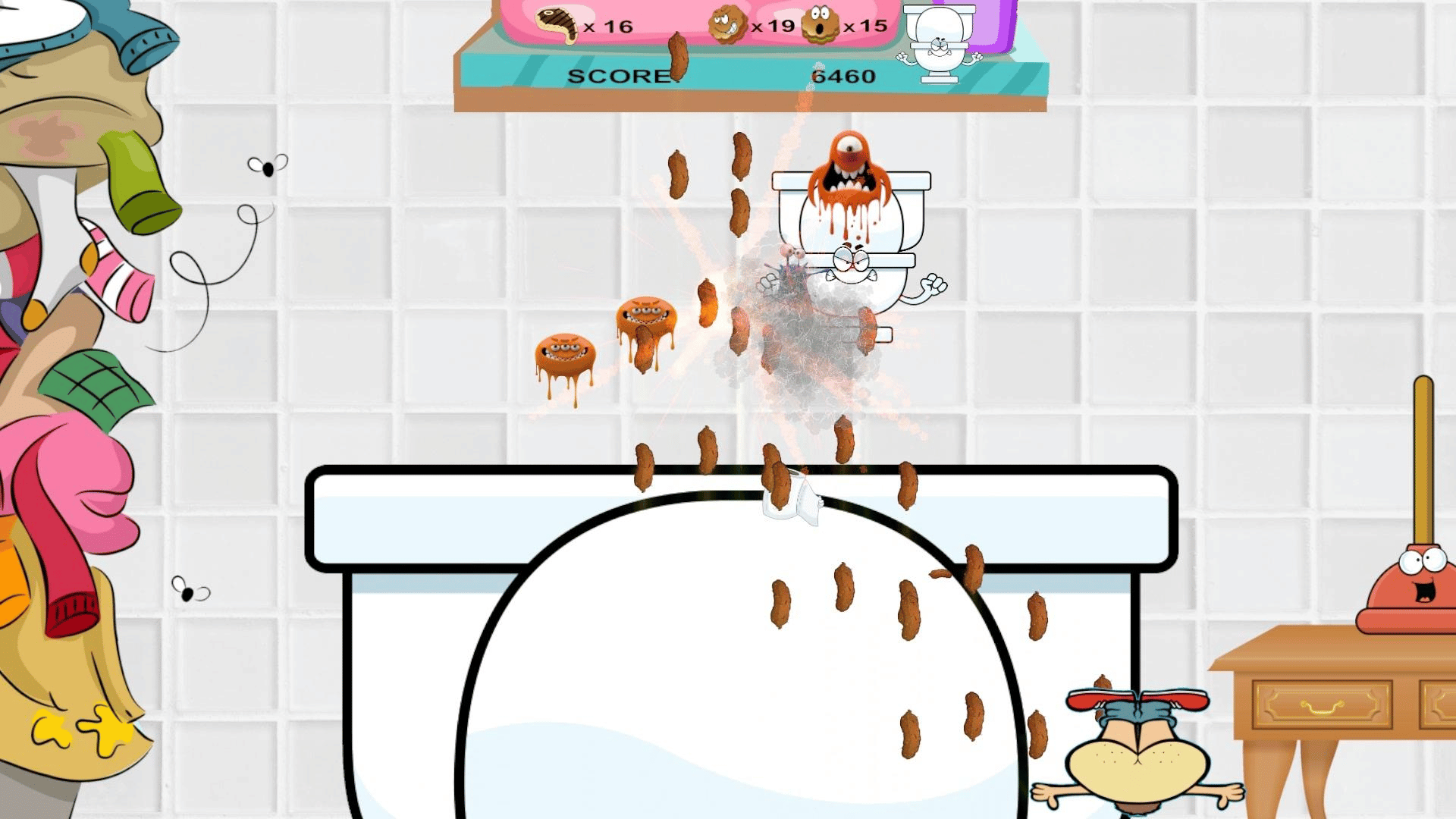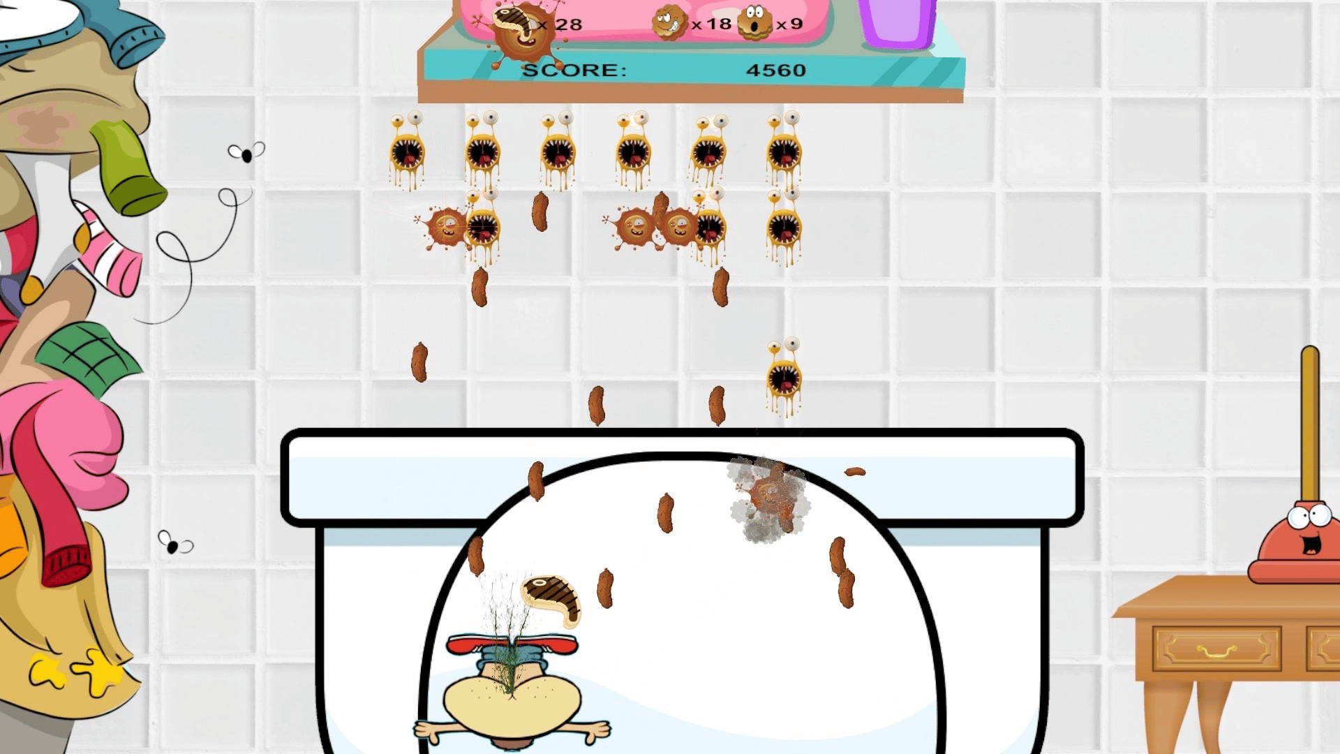 That's it! Bad enough his family won't leave him to use the John in peace, now alien turdzonians from Toiletron have invaded his loo! This means war! Not In My Crapper is a game that looks to be inspired by Space Invaders. You, as the protagonist Dan, fire turds at advancing aliens to destroy them. Collect steaks to upgrade in the Refrigerator shop. Get upgraded attackes like the "Dingleberry Assault" and "Shart Attack". Upgrade Dan's shuffle speed, turd speed, and turd power. Defeat these invaders and restore Dan's right to be the king on his throne.