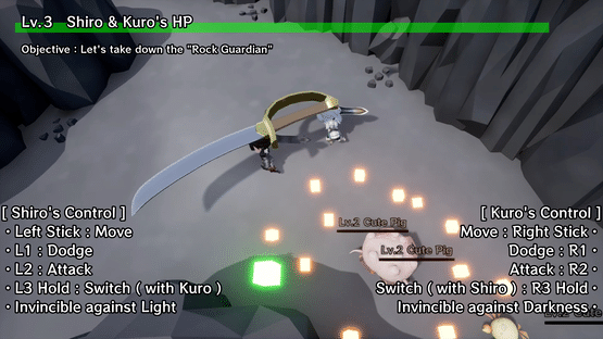 "Shirokuro's Adventure" is a top-down action mini-game where you can control two characters at the same time. Control the cute twin characters "Shiro" and "Kuro" to aim for the inner part of the island!