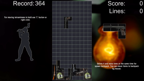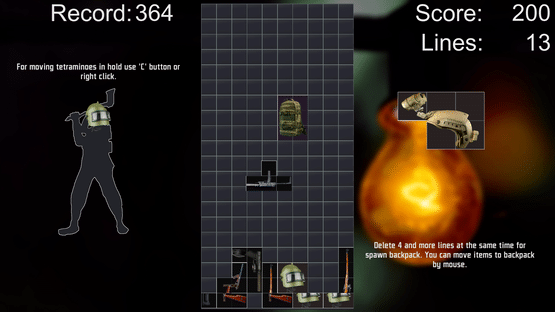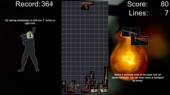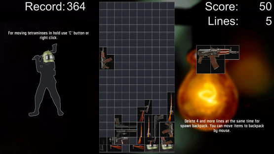 Escape from Tatris is a parody puzzle game with traditional gameplay and new solutions. You must collect as much loot as possible in your character's inventory. To do this, collect rows of objects and remove them. Collect combos and transfer loot to backpacks.