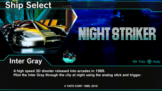 From the unique arcade machine with an analog joystick and pseudo 3D, comes Night Striker. Pilot Inter Gray in 2D sidescrolling levels, and shoot down enemies with your homing missiles.