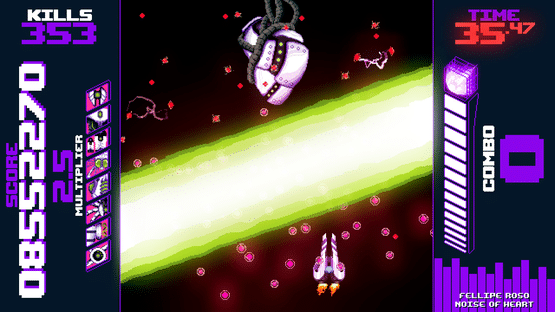 SCORCHING TECHBEAT ACTION! A frantic combo-based score attack shooter with roguelite elements. Make combos to earn more time. Master all weapons and defeat a raving mad machine. 100% arcade action. Online ranking. Lots of achievements. A Dual Gunstrike spin off.