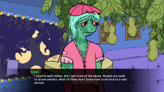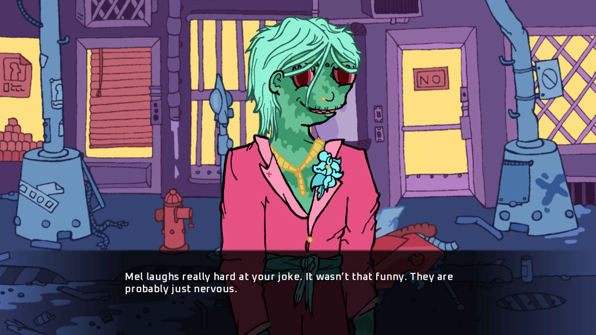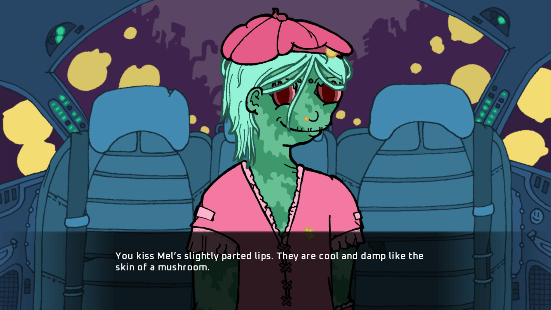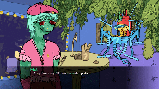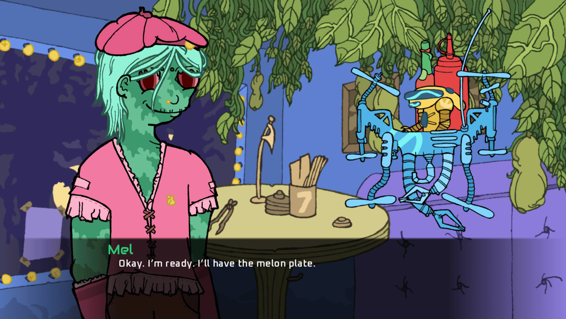 It's date night in the dystopian future. You're going out with Mel, a half-melon person with psychic powers. They seem a little weird, but at least they're cute. Choose where to go, what to do, and what to say in this highly interactive, romance visual novel.