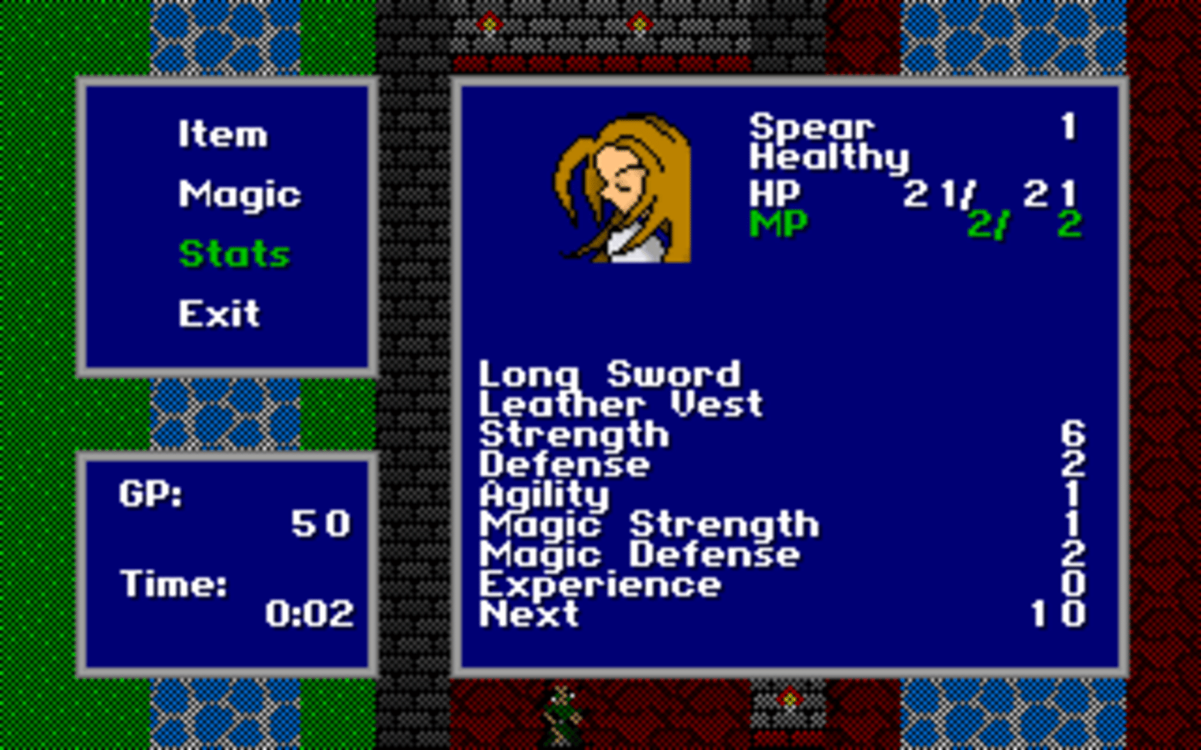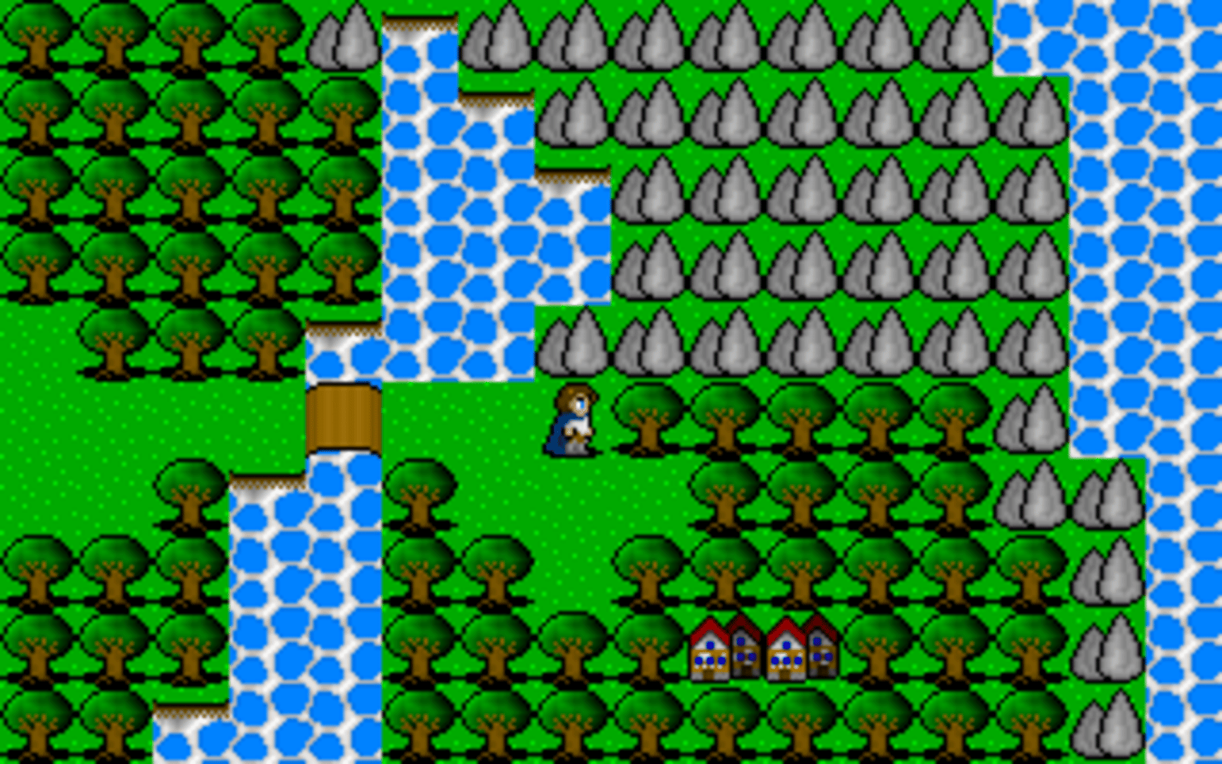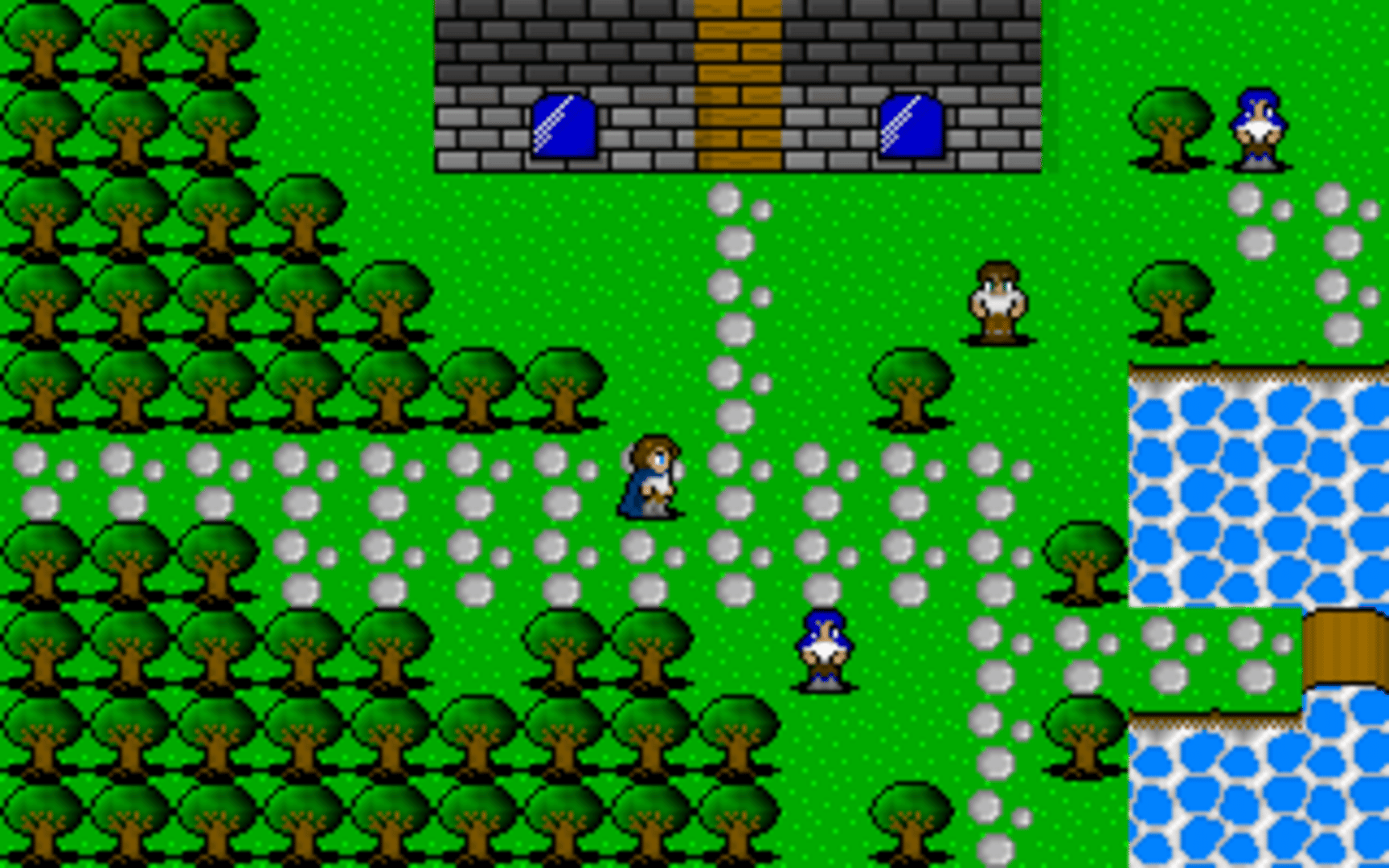 Mysterious Song is an RPG strongly influenced by the style of the early Final Fantasy games. Your character is a knight, sent by the king to investigate the trouble arising in the land, with the help of two other party members whom you pick up as you travel. The combat is turn-based, with a very simple magic system based on spell points. One party member is a mage, one specializes in physical combat, and your main character is a mix. There is no class selection, only leveling up.